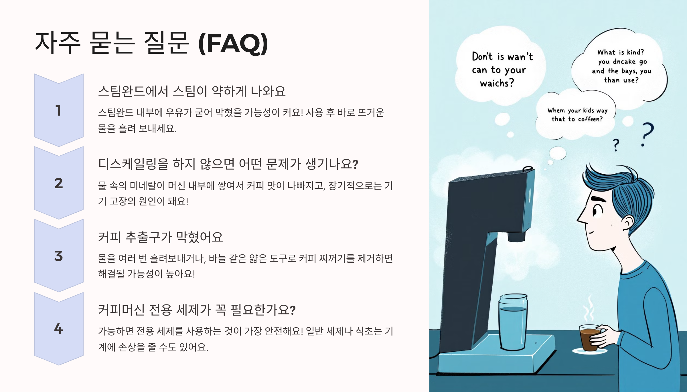 커피머신 청소를 제대로 하면 커피 맛이 좋아지고 기기 수명이 길어져요! 이제 마지막으로 자주 묻는 질문(FAQ) 섹션으로 넘어가볼게요! 📢
