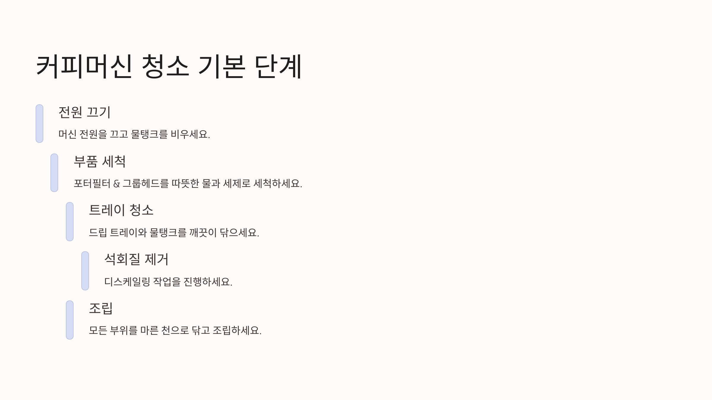 💡 Tip: 커피머신 청소를 꾸준히 하면 고장 없이 오랫동안 사용할 수 있어요! 매일 간단한 세척만 해줘도 커피 맛이 달라진답니다. ☕