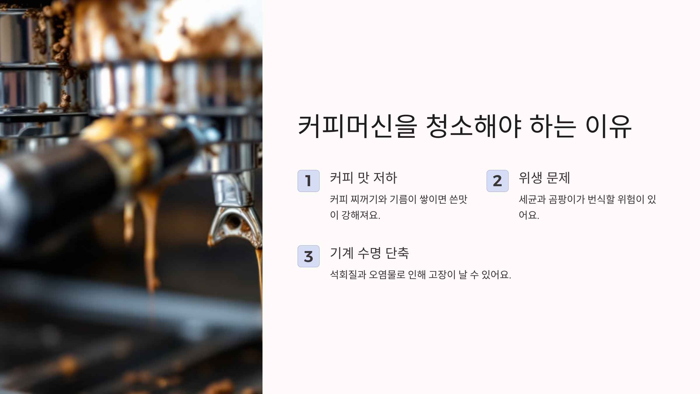 내가 생각했을 때 커피머신 청소를 귀찮아하면 안 되는 이유는 커피 맛과 건강 때문이에요! 매일 사용하는 만큼 꾸준한 관리가 필요하답니다. ☕✨