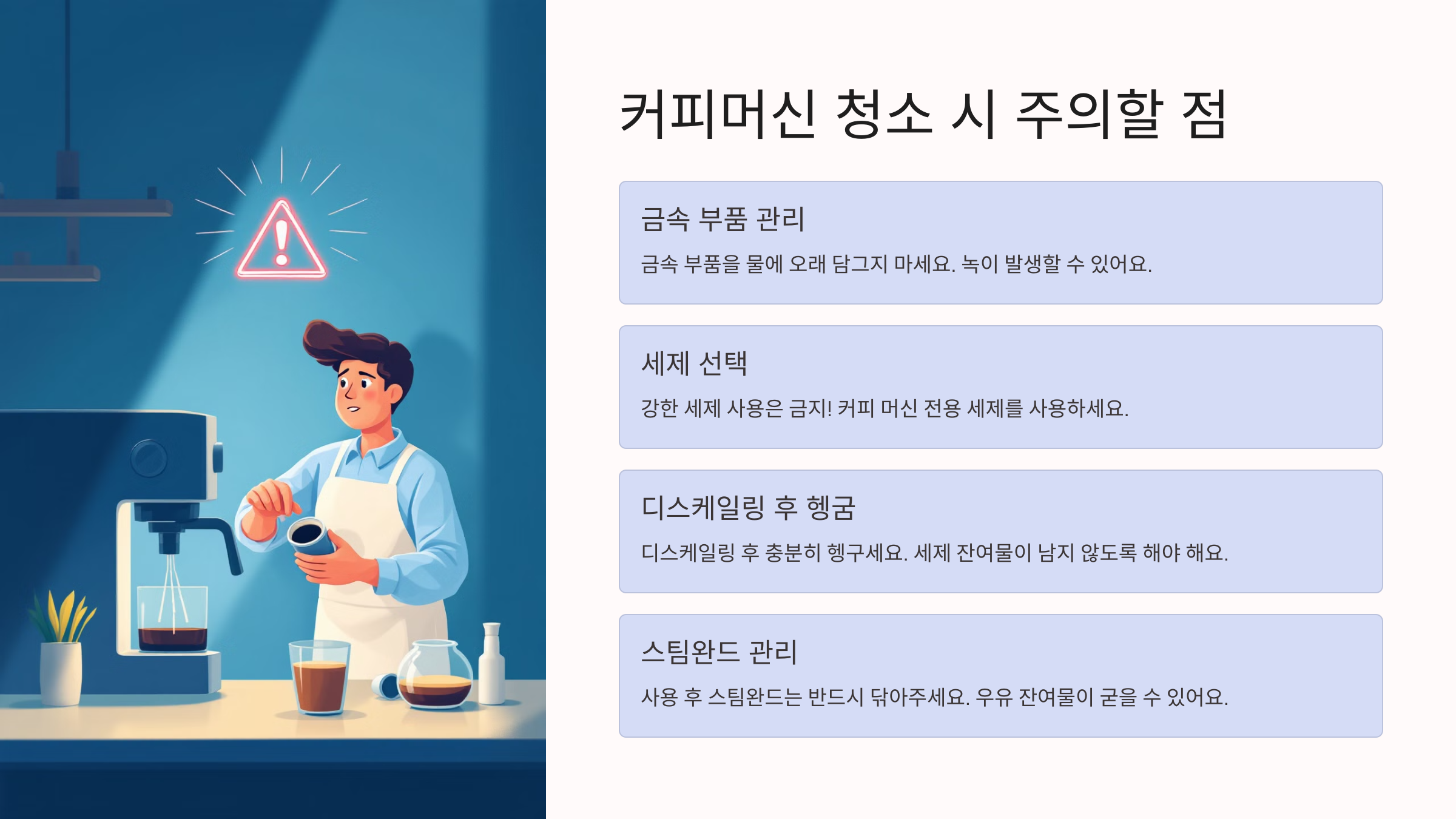 커피머신을 청소할 때 실수하기 쉬운 부분들이 있어요! 이 점만 주의하면 머신을 오랫동안 깨끗하게 유지할 수 있어요. 🚀