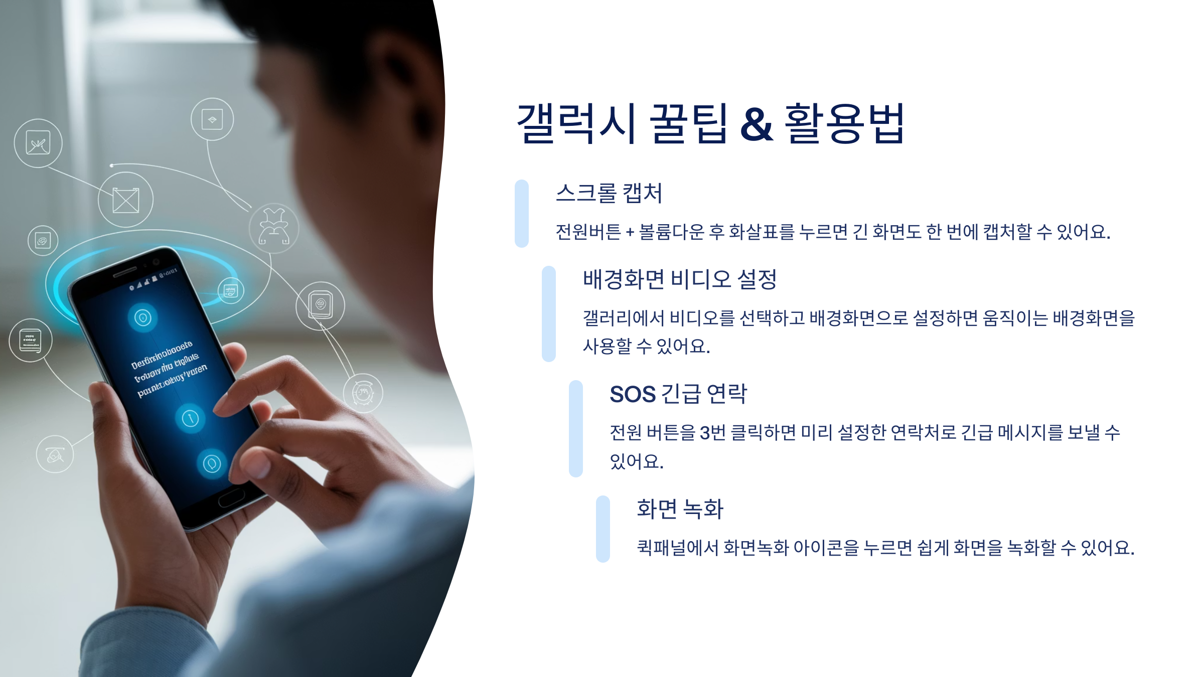 갤럭시 스마트폰은 기본 설정만으로 사용하는 사람이 많지만 사실 숨겨진 기능까지 활용하면 스마트폰 활용도가 200% 올라가요. 삼성 스마트폰은 사용자 맞춤 설정과 커스터마이징 기능이 아주 뛰어나기로 유명해요.