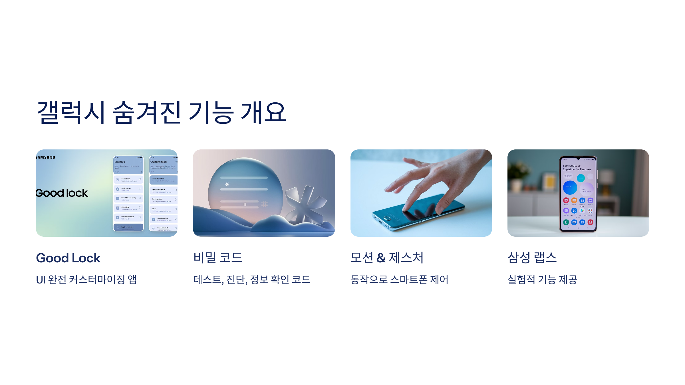 대표적으로 많이 사용하는 숨은 기능은 Good Lock 앱, 비밀 코드, 모션 & 제스처 기능, 삼성 랩스(실험실 기능), 그리고 고급 사용자 설정들이 있어요. 이 기능들은 숨겨져 있어서 모르면 그냥 못 쓰고 지나가는 경우가 많아요.