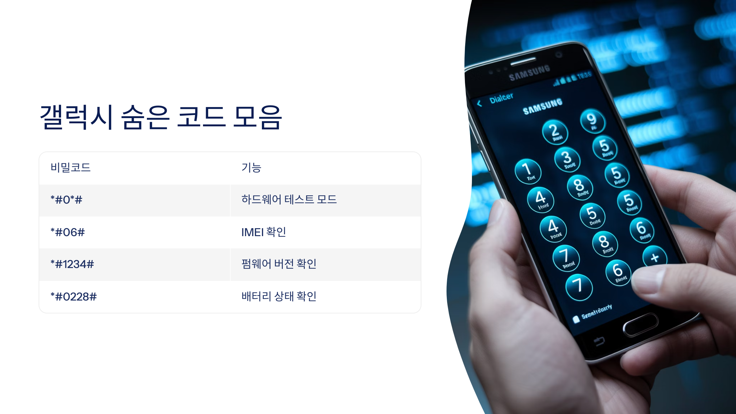 갤럭시 스마트폰에는 전화 앱에 입력하면 바로 실행되는 숨겨진 코드들이 있어요. 이걸 '갤럭시 비밀 코드'라고 부르는데, 진단, 테스트, 정보 확인에 정말 유용해요.