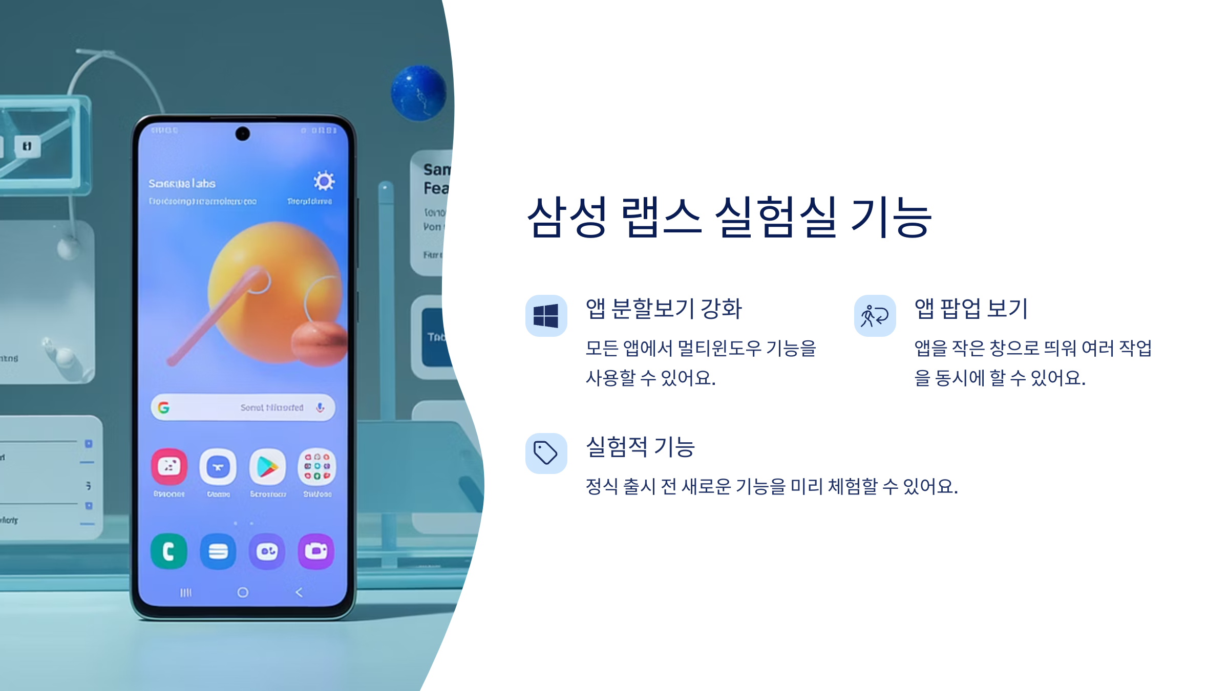삼성랩스(Samsung Labs)는 정식 출시 전 새로운 기능을 미리 체험할 수 있는 공간이에요. 실험적인 기능이지만 상당히 유용한 것들이 많아요.