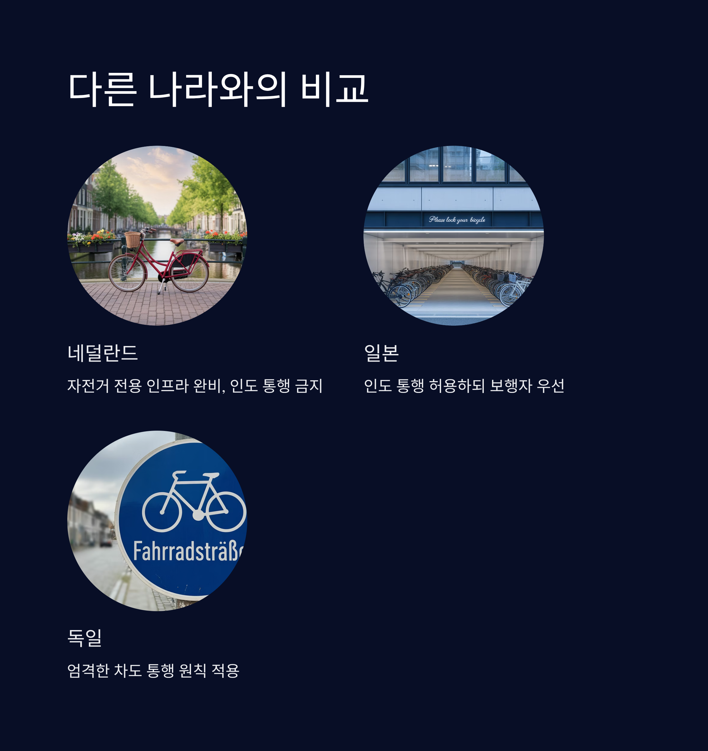 이처럼 나라마다 기준은 조금씩 다르지만, 공통적으로는 '보행자 우선', '자전거 안전 인프라 강화', '규정 준수'라는 방향성을 가지고 있어요. 우리나라도 점점 개선되는 중이니 기대해도 좋아요! 🌍
