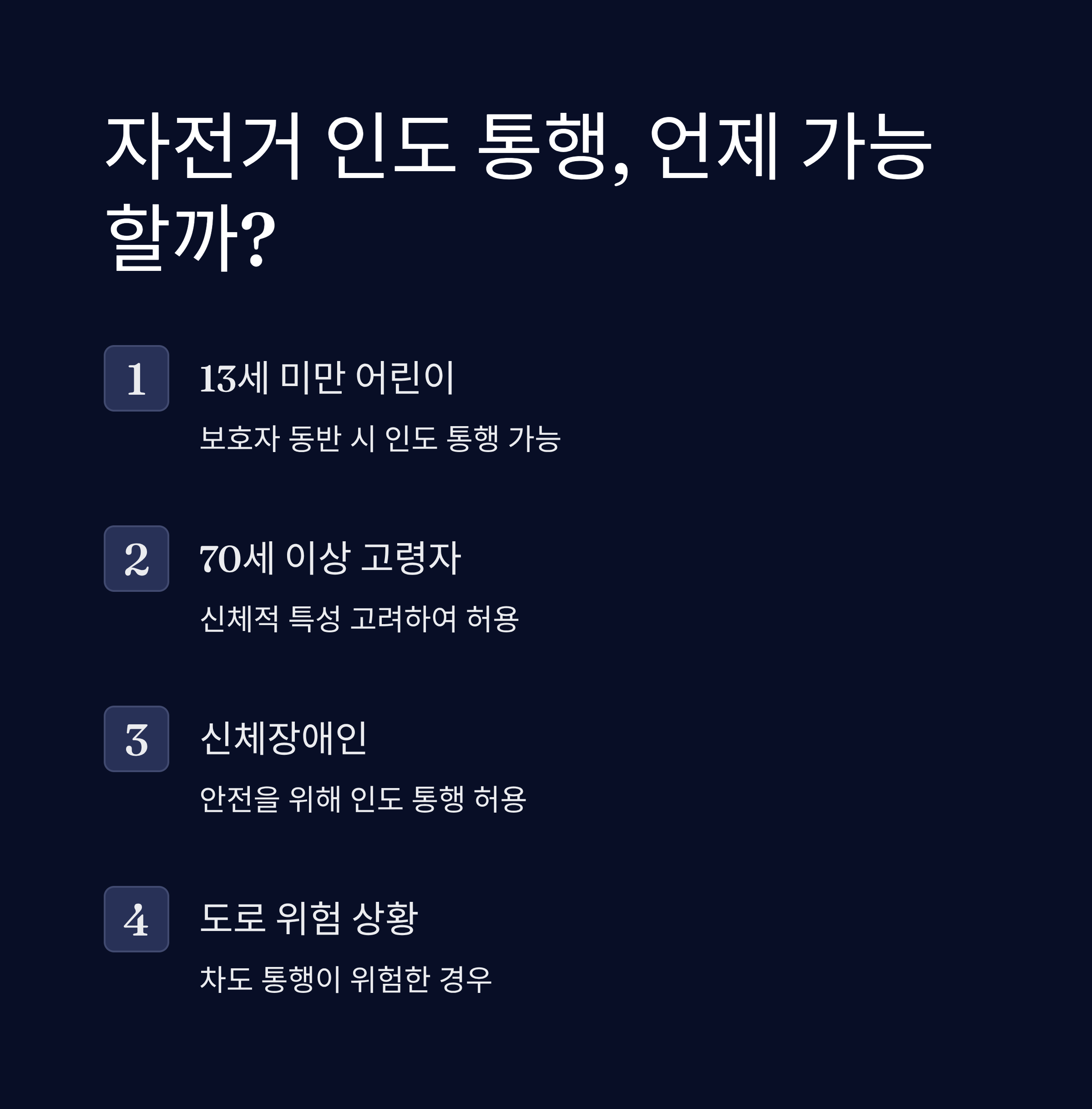 두 번째는 자전거도로가 없고, 차도 통행이 위험하다고 판단되는 경우 경찰청장이 고시한 지역에 한해 예외적으로 인도 통행이 가능하다는 점이에요. 마지막으로, 자전거 통행이 허용된 인도에는 도로에 표지판이나 노면 표시가 반드시 있어야 해요. 이 세 가지 조건 중 하나라도 충족되면 인도에서 자전거를 탈 수 있어요.