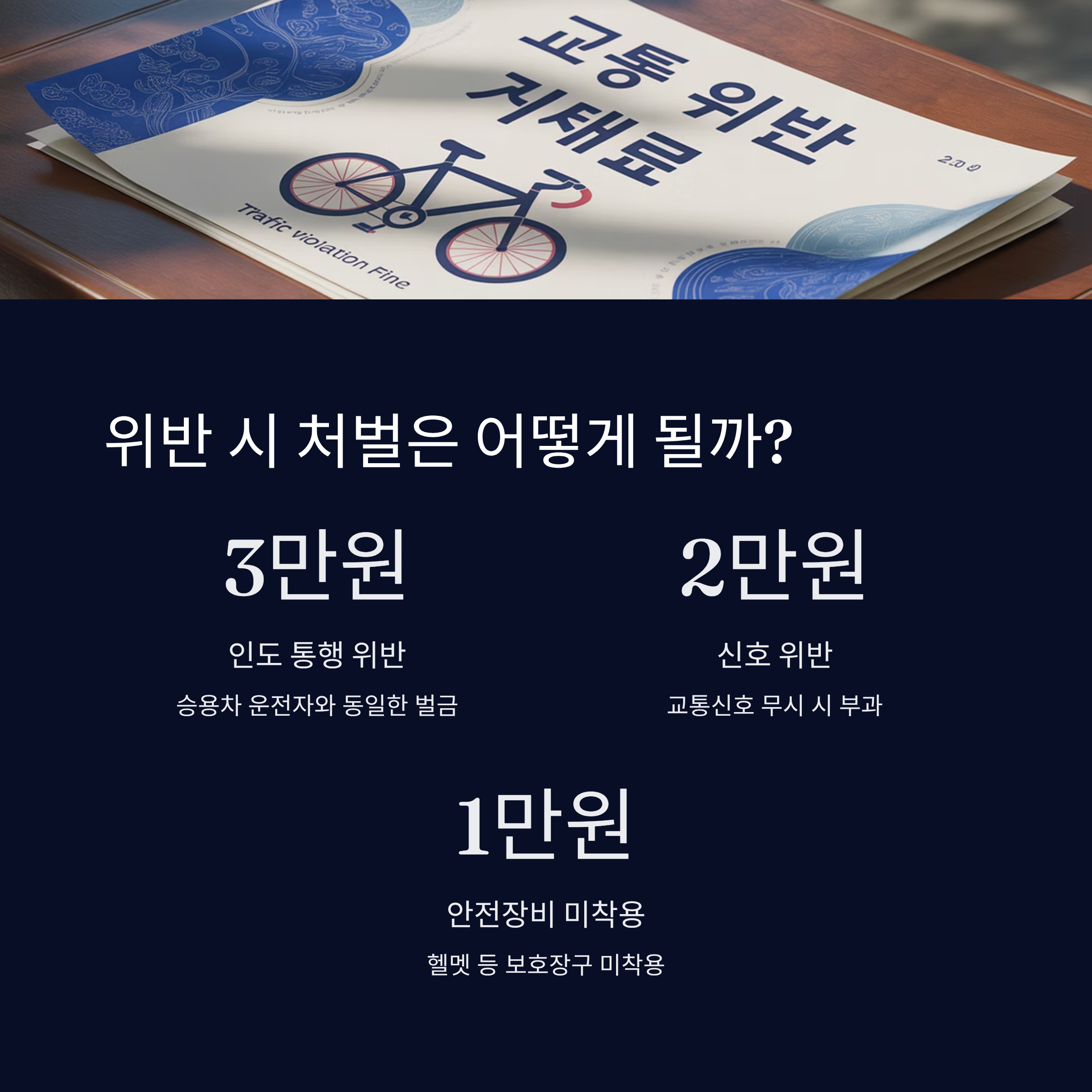 자전거 관련 규정을 위반했을 때는 처벌도 받을 수 있어요. 하지만 자동차처럼 면허가 필요하지 않기 때문에 ‘벌점’은 없지만 ‘범칙금’은 부과돼요. 예를 들어, 신호 위반은 3만원, 보도 통행 시 보행자 방해는 2만원의 범칙금이 부과될 수 있어요.