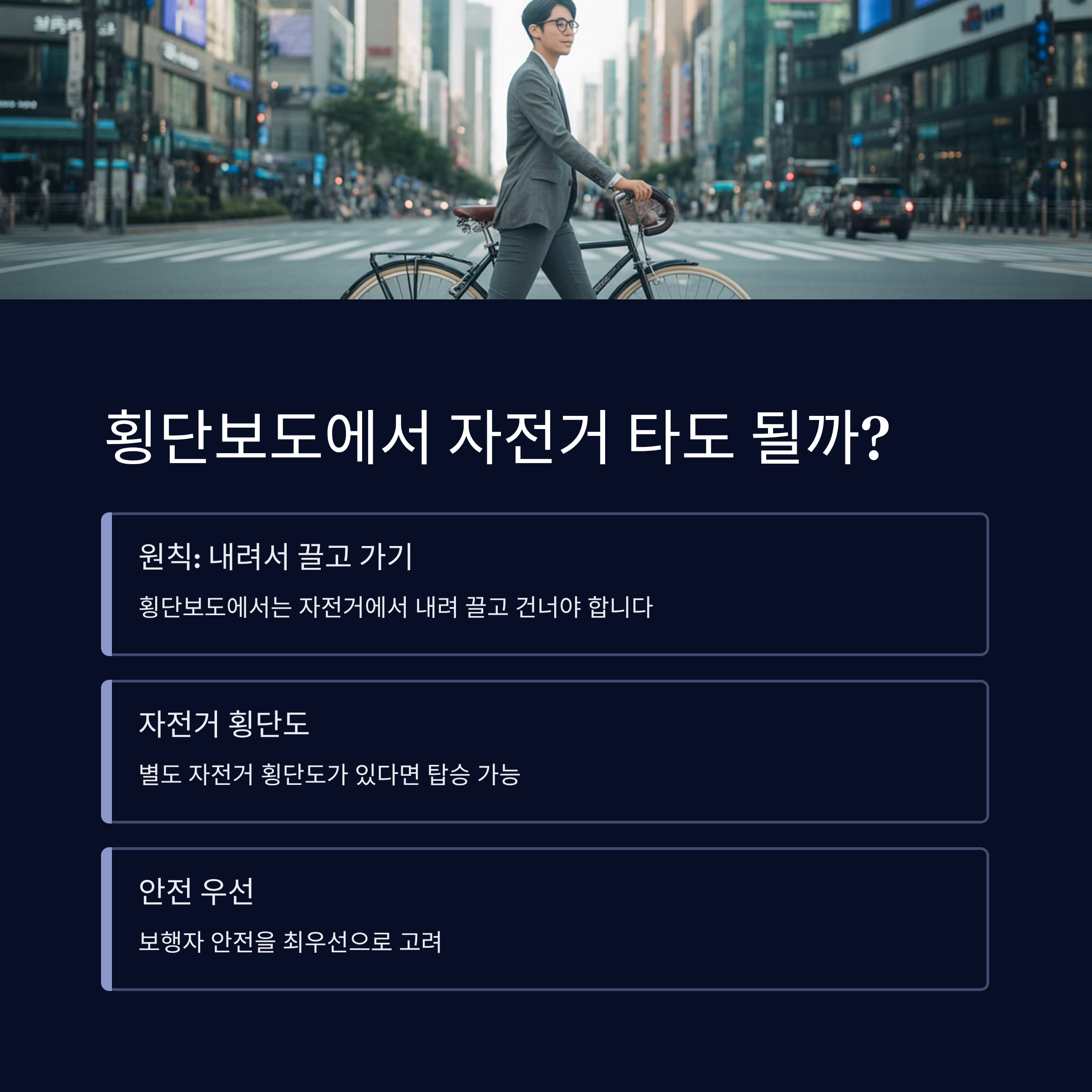횡단보도에서 자전거를 타고 건너는 건 가능할까요? 정답은 '경우에 따라 다르다'예요. 일반적으로 자전거는 횡단보도에서 내려 끌고 건너야 해요. 자전거는 ‘차’로 간주되기 때문에 보행자 전용 공간을 그대로 타고 건너는 것은 위법일 수 있어요.