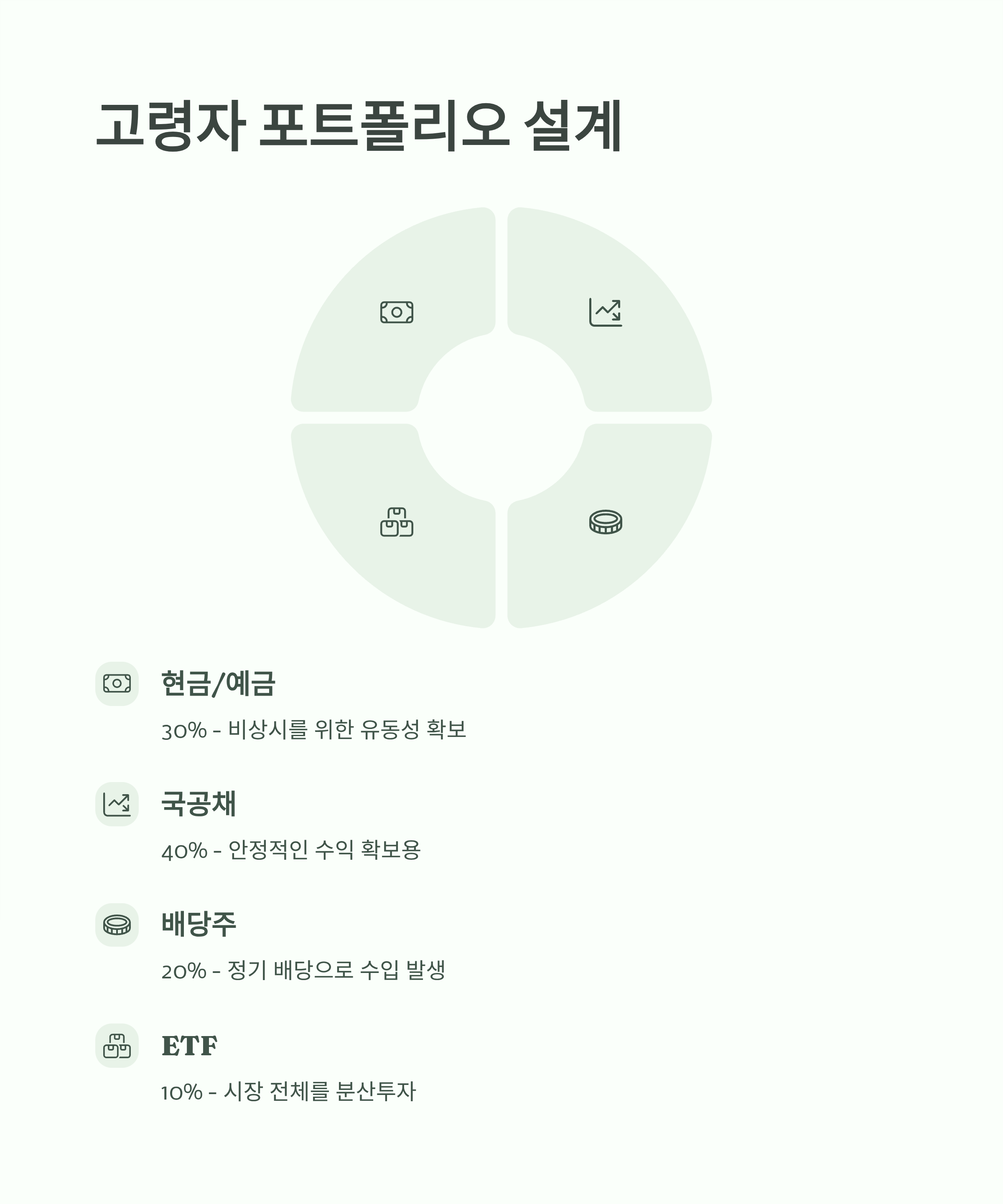 고령자의 투자 포트폴리오를 설계할 때 가장 중요한 기준은 ‘안정성과 유동성’이에요. 투자금의 대부분은 안전자산에 두고, 일부만 주식에 투자하는 방식이 기본이에요. 예를 들어 전체 자산의 70%는 현금성 자산이나 채권형 상품에 두고, 30% 정도만 주식에 투자하는 구조가 대표적이에요.