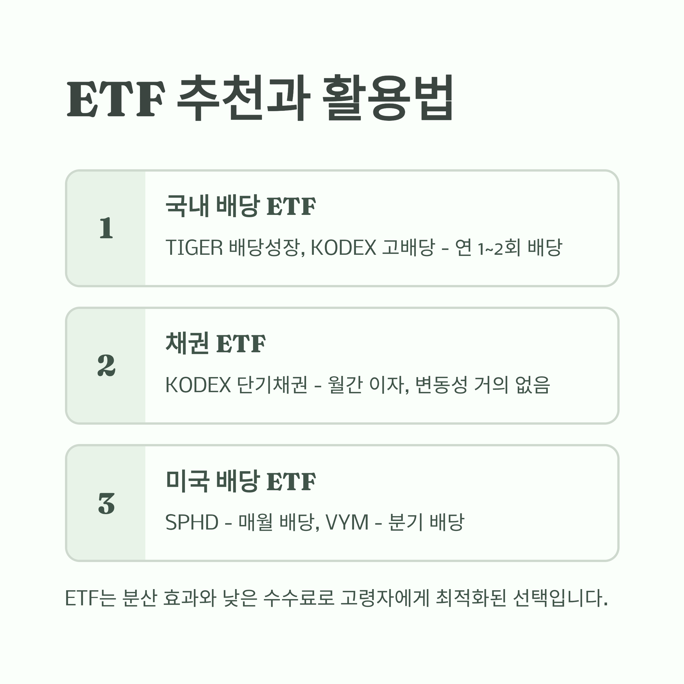 배당 중심 ETF로는 ‘TIGER 배당성장’, ‘KODEX 고배당’, ‘KBSTAR 고배당’, ‘ARIRANG 고배당주’ 등이 있고, 안정형 채권 ETF로는 ‘KOSEF 국고채 10년’, ‘KODEX 단기채권’이 있어요. 이들은 분산 효과는 물론 정기적 수익도 기대할 수 있어요.