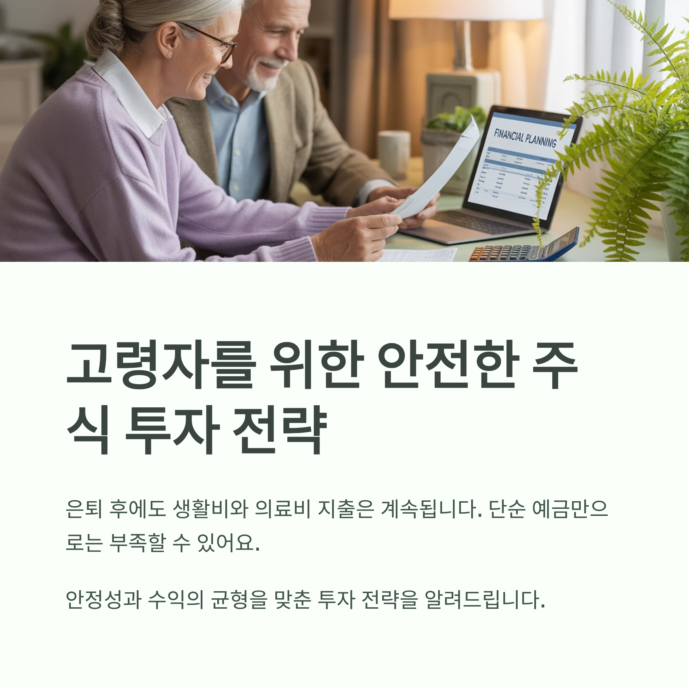 고령자 투자에 있어 가장 중요한 건 ‘안정성과 수익의 균형’이에요. 은퇴 이후에도 생활비나 의료비 같은 고정 지출이 지속되기 때문에 단순한 예금만으로는 부족할 수 있죠. 그래서 주식 투자는 고령자에게도 점점 필요한 선택지가 되고 있어요.