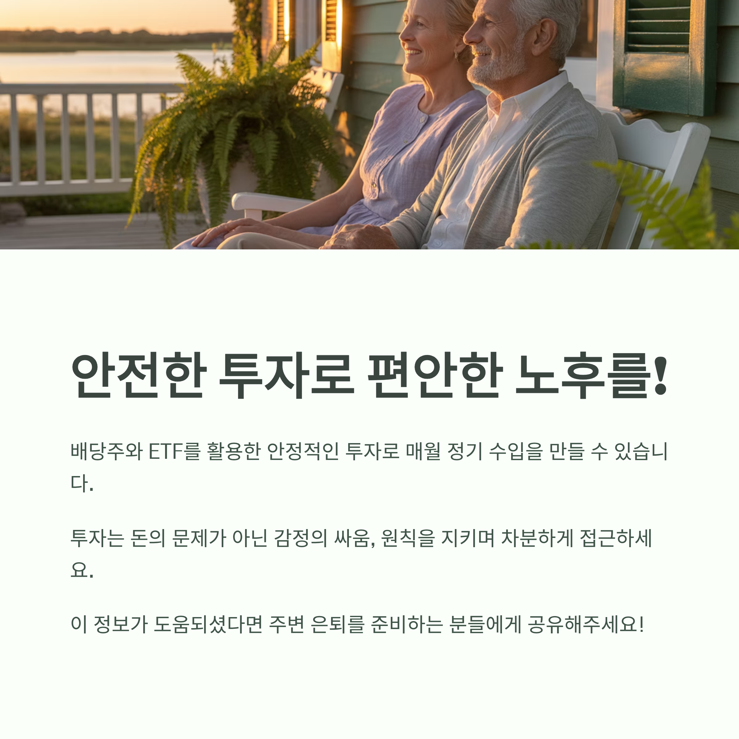 또한 자녀에게 경제적 부담을 주고 싶지 않은 분들도 많아요. 자녀의 생활이 팍팍한 요즘, ‘내 노후는 내가 책임지자’는 철학을 가진 분들이 늘어나고 있답니다. 그래서 많은 분들이 ‘배당주 투자’나 ‘ETF 투자’를 고민하게 되는 거죠.