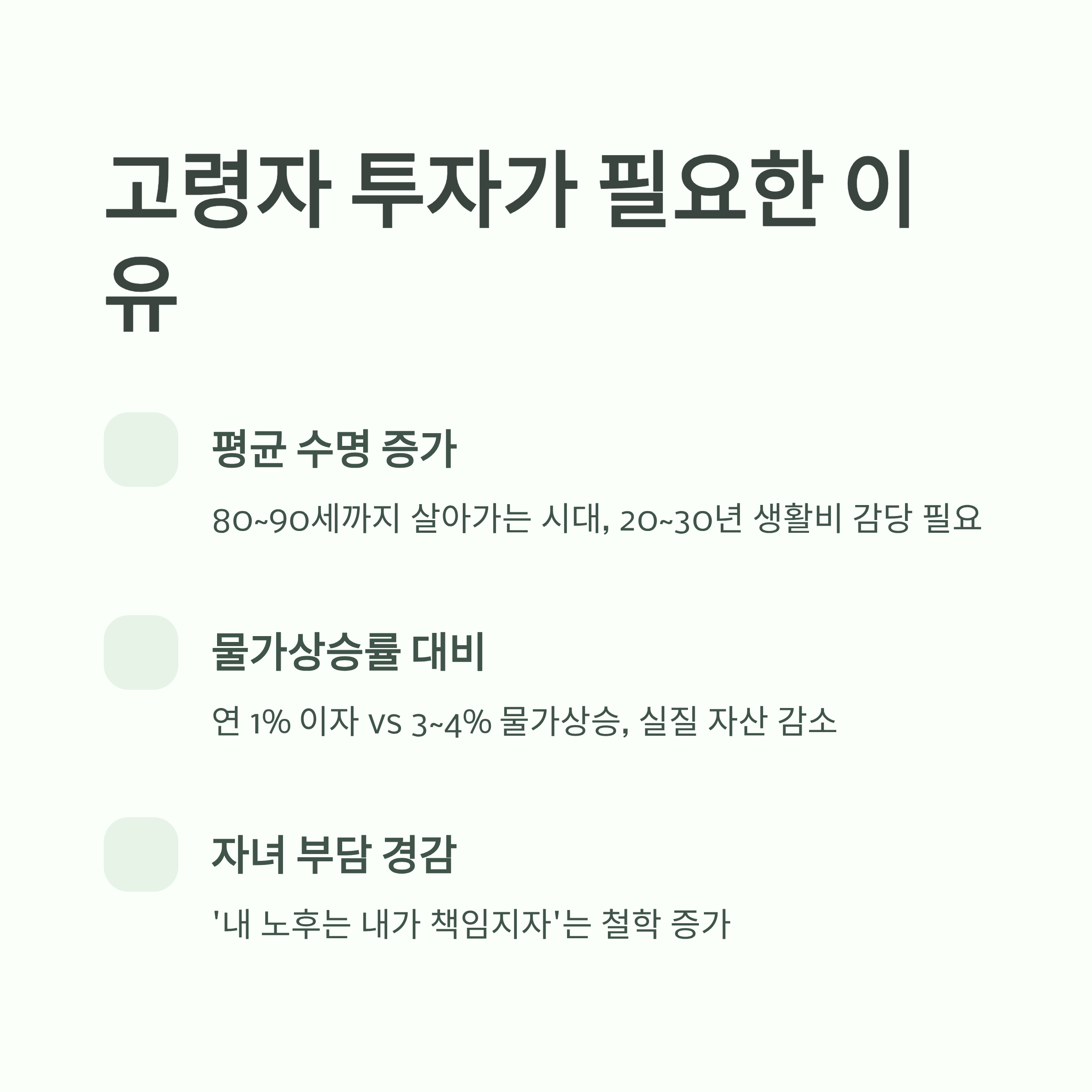 고령자가 주식 투자에 관심을 가져야 하는 이유는 꽤 많아요. 먼저, 평균 수명이 길어지면서 80~90세까지 살아가는 시대가 되었죠. 단순히 연금을 수령하거나 예금을 쌓아두는 것만으로는 20~30년 동안 생활비를 감당하기 어렵다는 의견이 많아요. 고령자라도 자산이 일정 부분 증식되어야 장기적인 생활 안정이 가능하답니다.