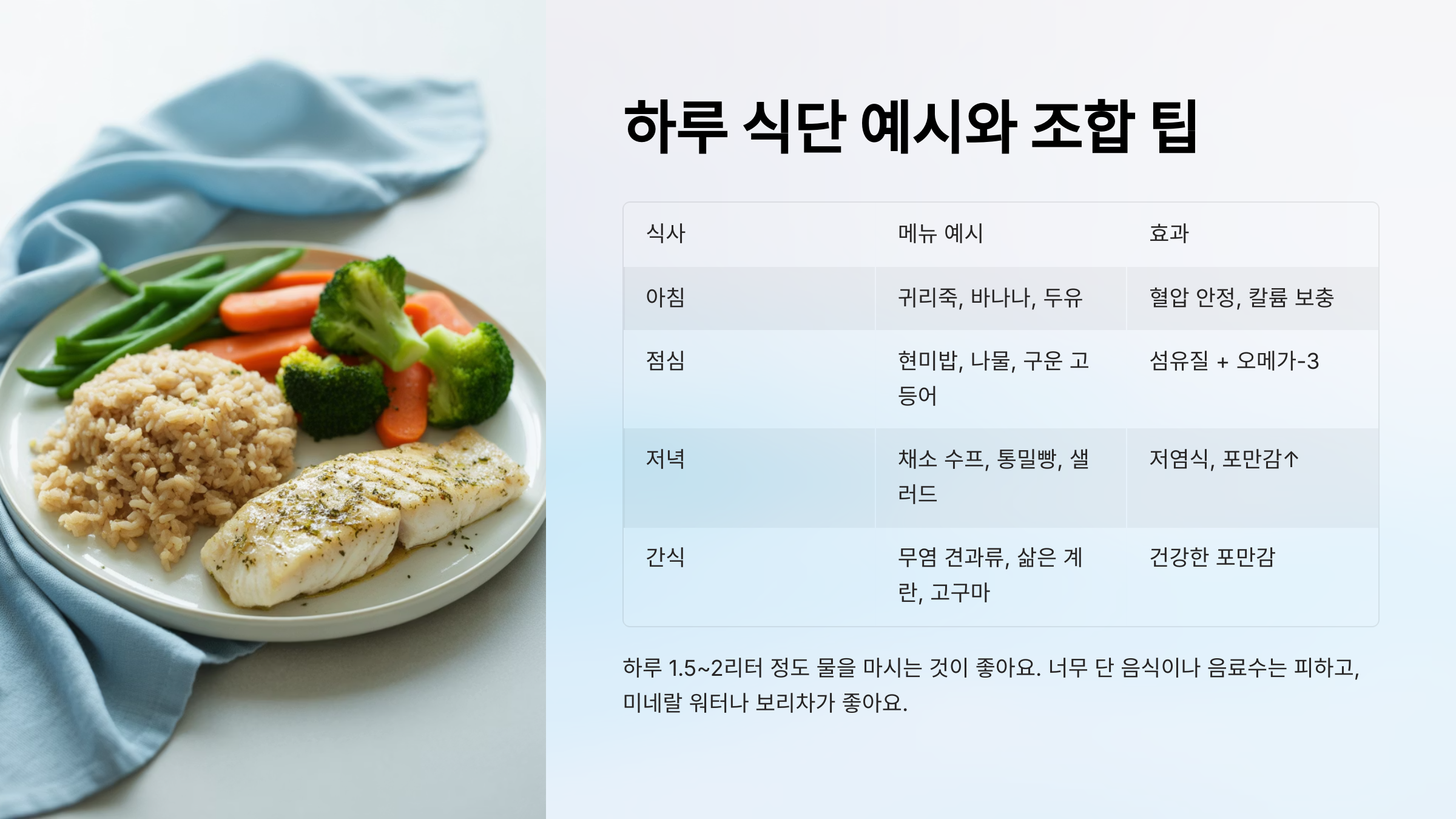 아침에는 나트륨이 낮고 포만감 있는 식단이 좋아요. 예를 들어 귀리죽에 바나나 한 개, 두유 한 컵이면 충분해요. 점심은 통곡물 밥과 채소반찬, 생선 위주의 구성이 이상적이고요. 저녁은 너무 늦지 않게, 소금이 적은 수프나 샐러드를 추천해요.
