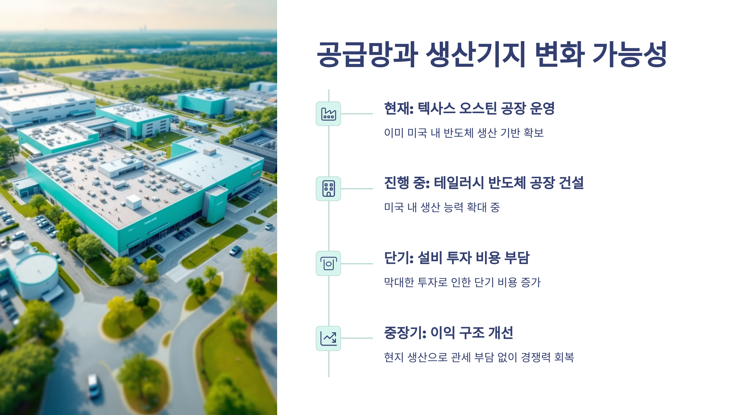 삼성전자는 이미 미국 텍사스 오스틴에 반도체 공장을 운영 중이며, 최근 테일러시 반도체 공장도 건설 중이에요. 이런 선제적 투자로 인해 ‘현지 생산 확대’에 유리한 입장이죠.