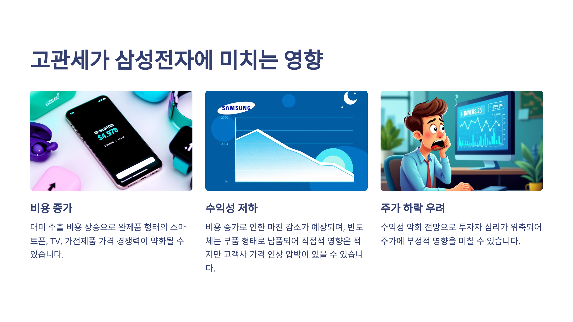 고관세가 적용되면 삼성전자의 대미 수출 비용이 상승하게 돼요. 특히 스마트폰, TV, 가전제품처럼 완제품 형태로 미국 시장에 직접 수출되는 제품은 가격 경쟁력이 약화될 수 있어요.