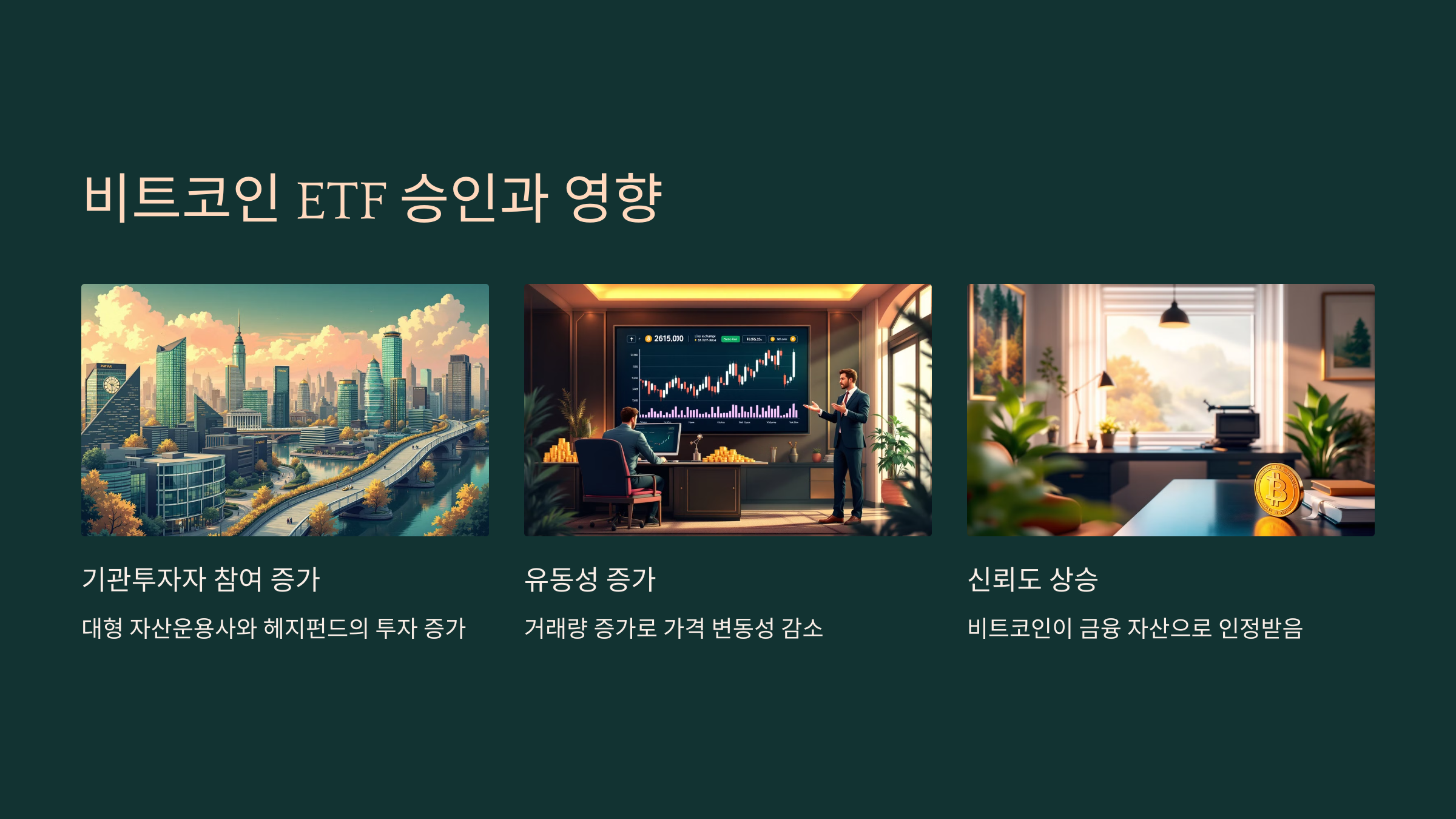 ✔️ 대중화와 신뢰도 상승: ETF 승인은 비트코인이 금융 자산으로 인정받았다는 의미로, 대중의 신뢰가 높아졌어요.