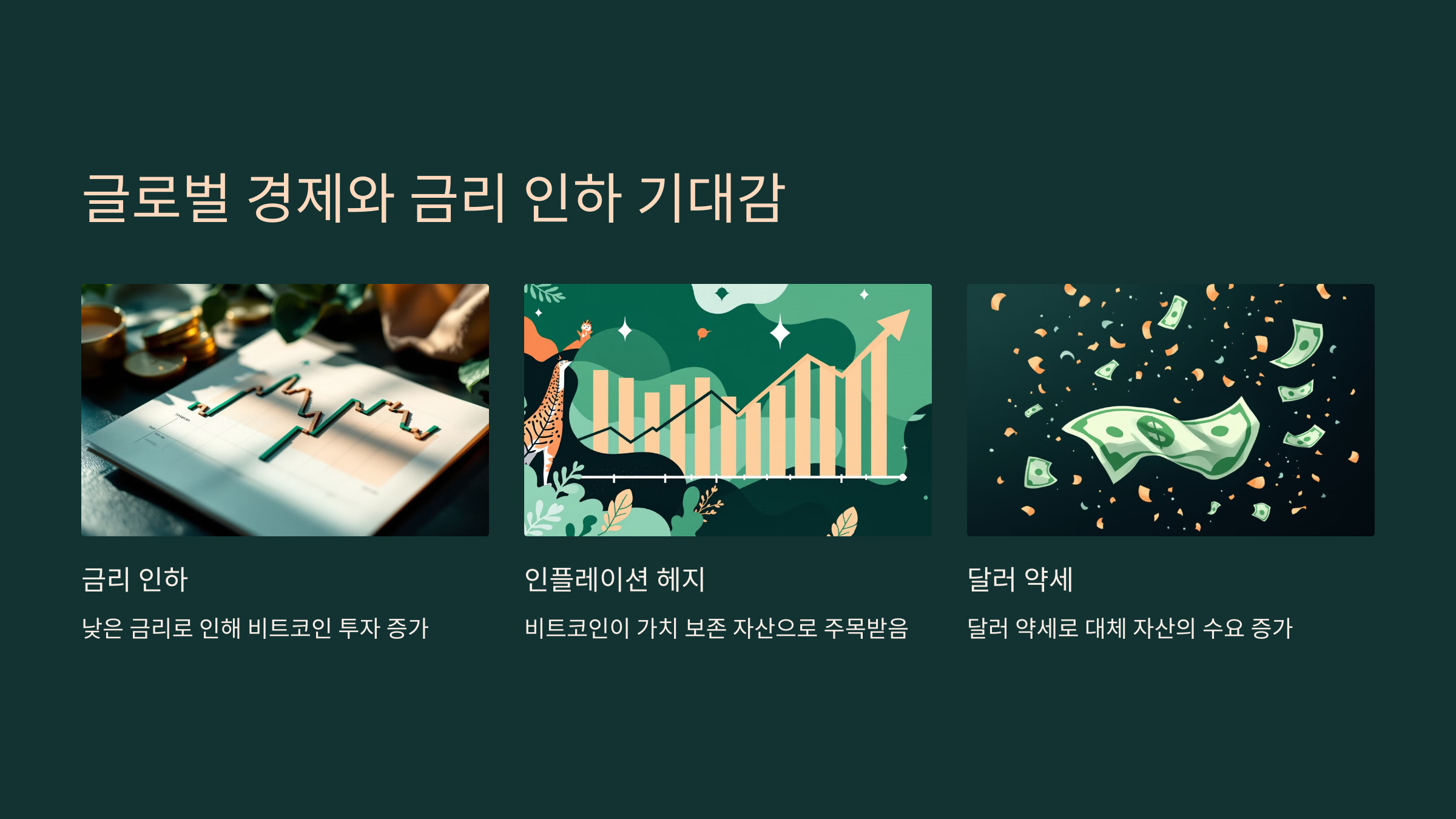 ✔️ 글로벌 경제 상황: 미국 연방준비제도(Fed)의 금리 인하 기대감과 인플레이션에 대한 헤지 수단으로 비트코인에 대한 관심이 높아지고 있어요.