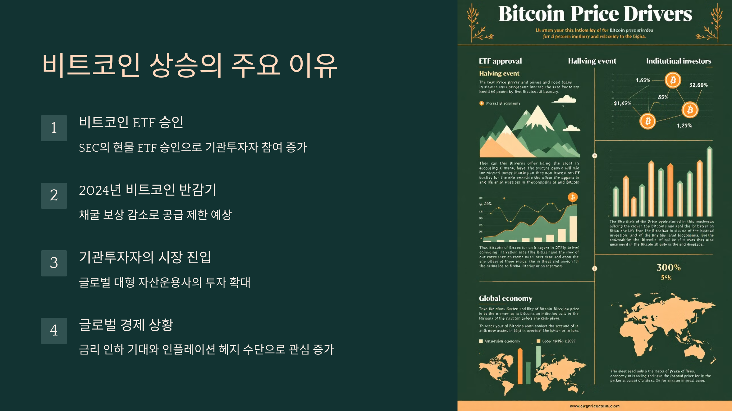 특히 **ETF 승인, 2024년 반감기, 기관투자자들의 참여**, 그리고 **글로벌 경제 상황**이 중요한 영향을 미치고 있어요. 이 요소들이 비트코인 가격에 어떤 영향을 주는지 알아보고, 앞으로의 목표 가격도 예측해 볼게요. 😊