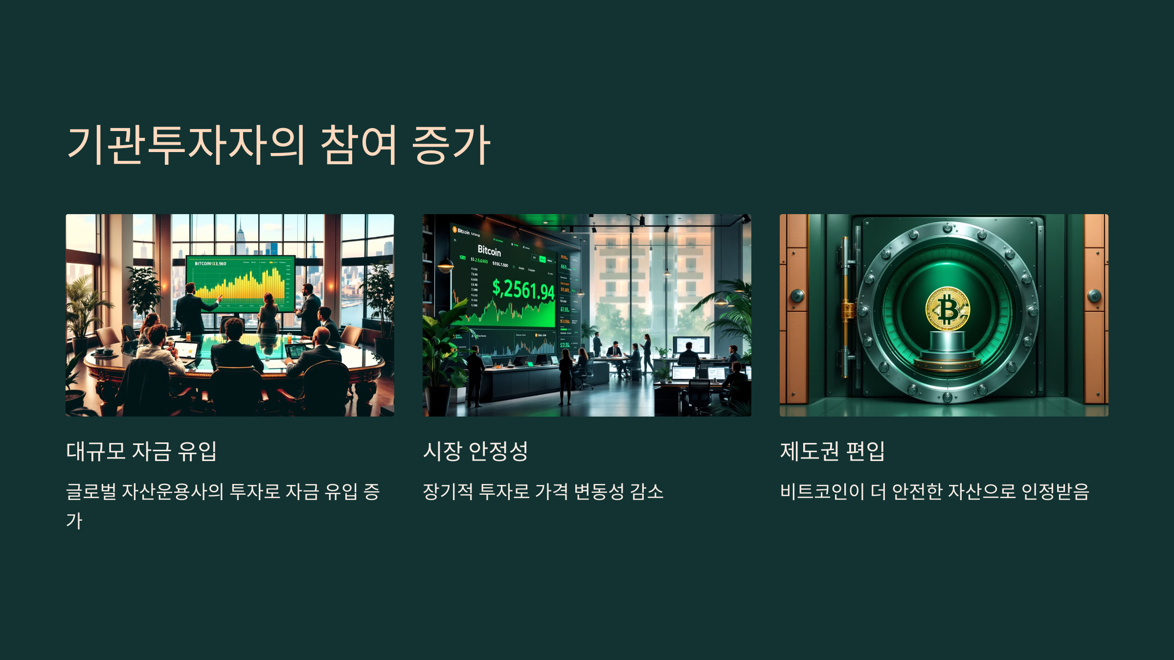 ✔️ 규제 및 제도권 편입: 기관들이 참여하면서 비트코인이 규제와 제도권 안에서 더 안전한 자산으로 인정받고 있어요.