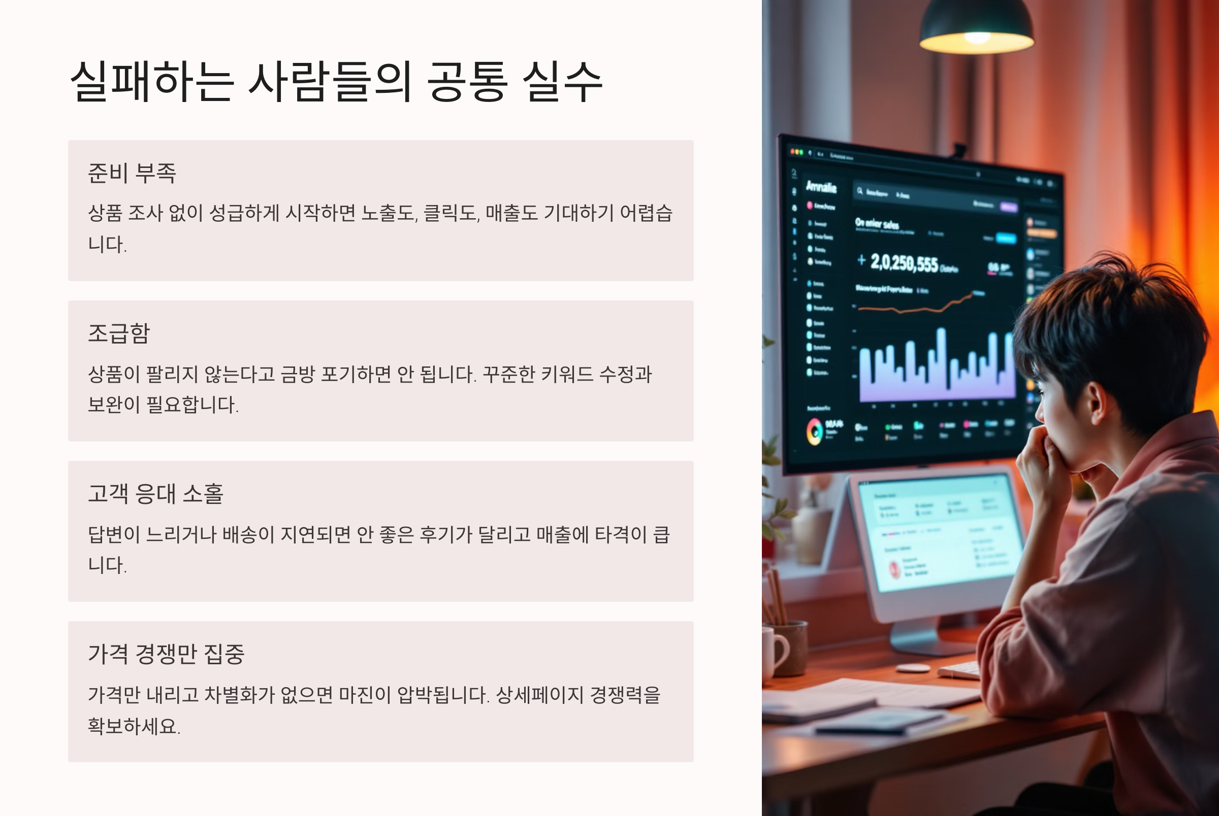 이 시점부터는 단순 판매자가 아니라 ‘운영자’ 마인드가 필요해요. 분석하고 조정하고 테스트해보면서 내 상점을 점점 키워가는 재미도 있어요. 다음 박스에서는 많은 초보 셀러들이 실패하는 이유와 피해야 할 실수들을 콕 짚어드릴게요 🧨🚫