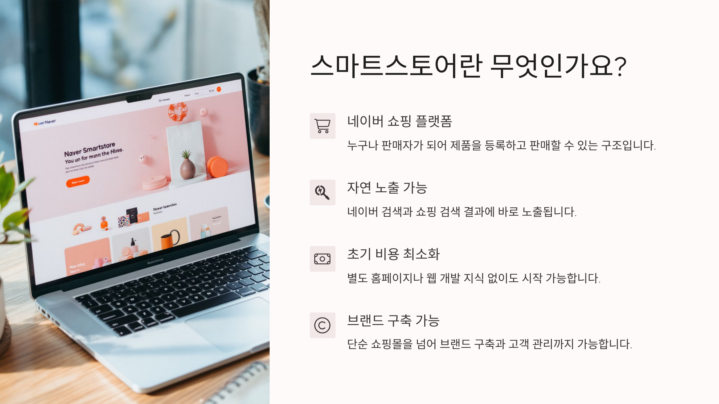 스마트스토어는 네이버에서 제공하는 온라인 쇼핑 플랫폼이에요. 누구나 판매자가 되어 제품을 등록하고 판매할 수 있는 구조라서, 사업자등록만 있으면 누구든지 시작할 수 있다는 점이 가장 큰 장점이에요.