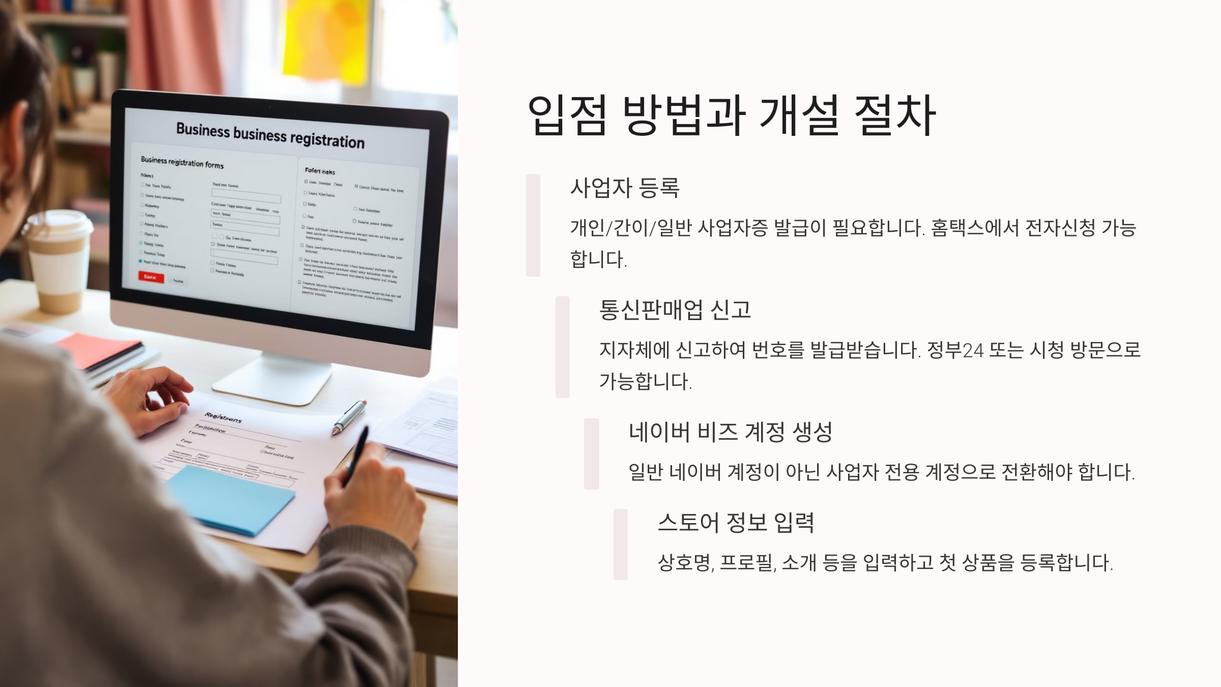 스마트스토어는 시작 진입장벽이 낮은 편이지만, 처음 접하는 분들에겐 단계가 다소 복잡하게 느껴질 수 있어요. 하지만 하나하나 따라가면 누구든 쉽게 입점할 수 있답니다! 시작 전 사업자등록은 꼭 필요해요.