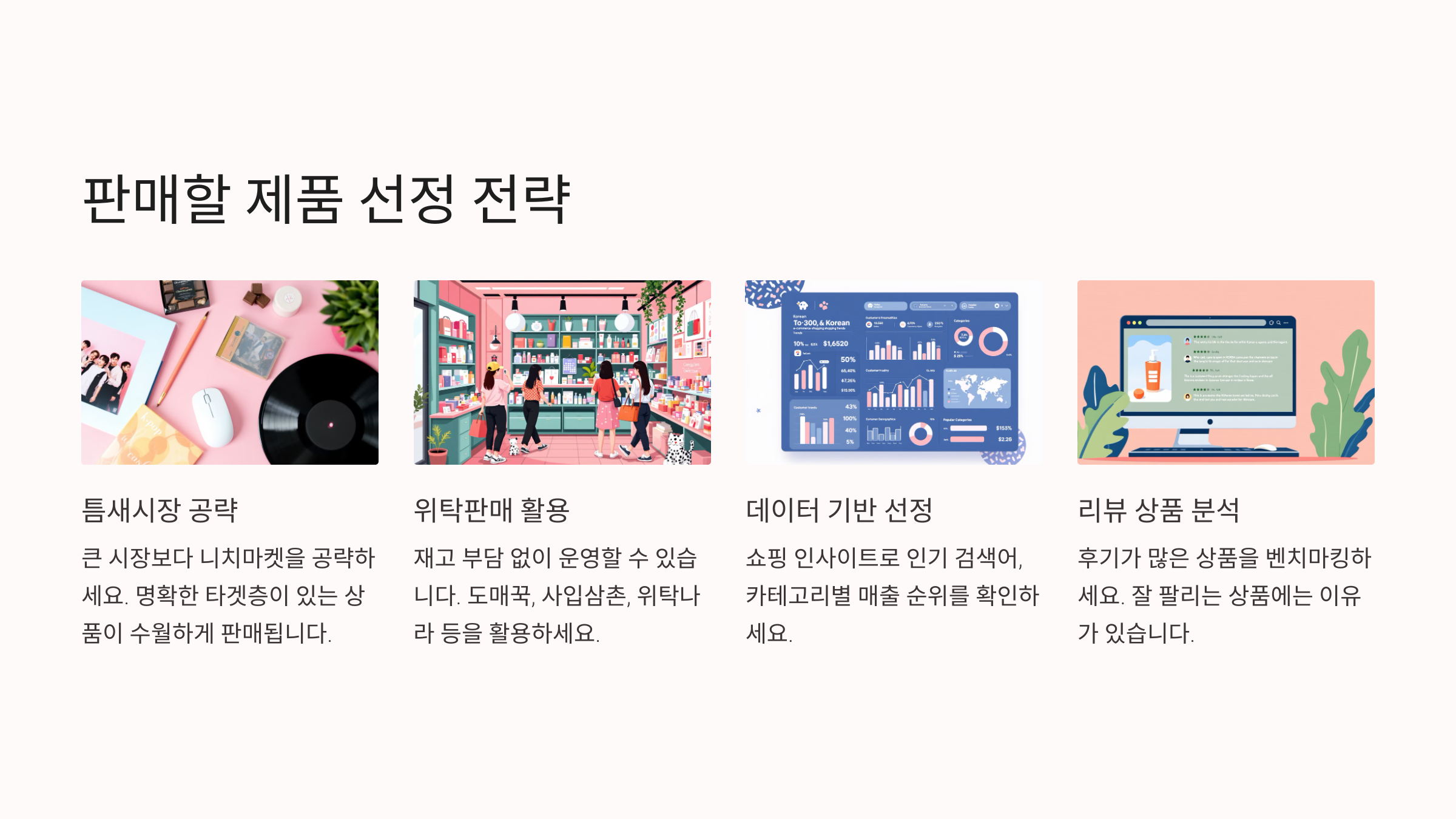 처음 시작하는 분이라면 너무 큰 시장보다는 틈새시장(니치마켓)을 공략하는 게 좋아요. 예를 들어 '강아지 전용 칫솔', '아기용 손수건', '캠핑용 소품'처럼 명확한 타겟층이 있는 상품이 훨씬 수월하게 판매돼요.
