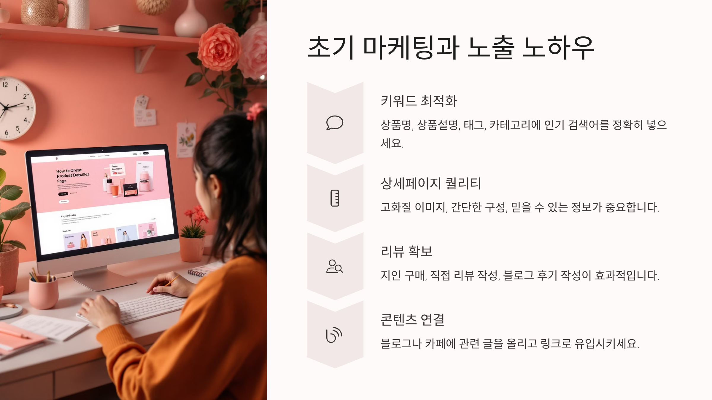 초기엔 지인 구매, 직접 리뷰 작성, 블로그 후기 작성도 효과적이에요. 네이버는 콘텐츠와 연결되는 쇼핑을 선호하므로 블로그나 카페에 관련 글을 올리고 링크로 유입시키는 것도 꽤 도움이 된답니다.