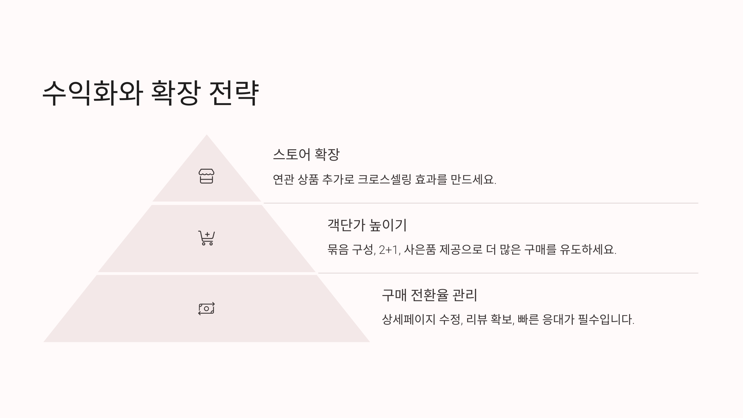 두 번째는 객단가(한 사람이 쓰는 평균 금액) 높이기예요. 묶음 구성이나 2+1, 사은품 제공 전략으로 자연스럽게 더 많은 구매를 유도할 수 있어요. 예를 들어 1개당 배송비가 드는 상품이라면 3개 세트를 구성해 이득처럼 보이게 만들 수 있어요.