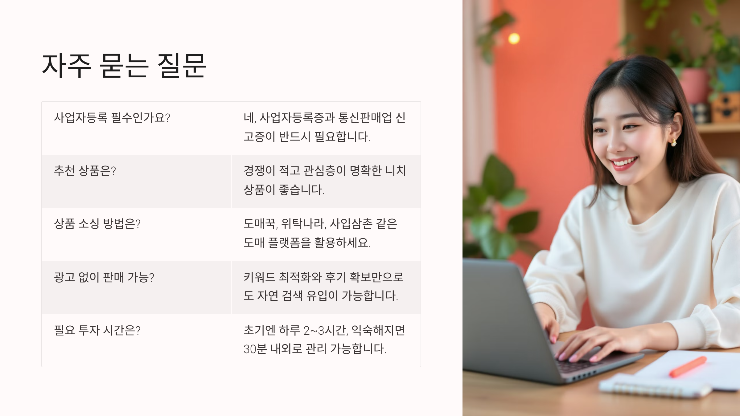 A5. 초기엔 상품 등록, 키워드 조사, 상세페이지 제작에 하루 2~3시간 정도가 필요해요. 운영에 익숙해지면 하루 30분 내외로 관리 가능해요.