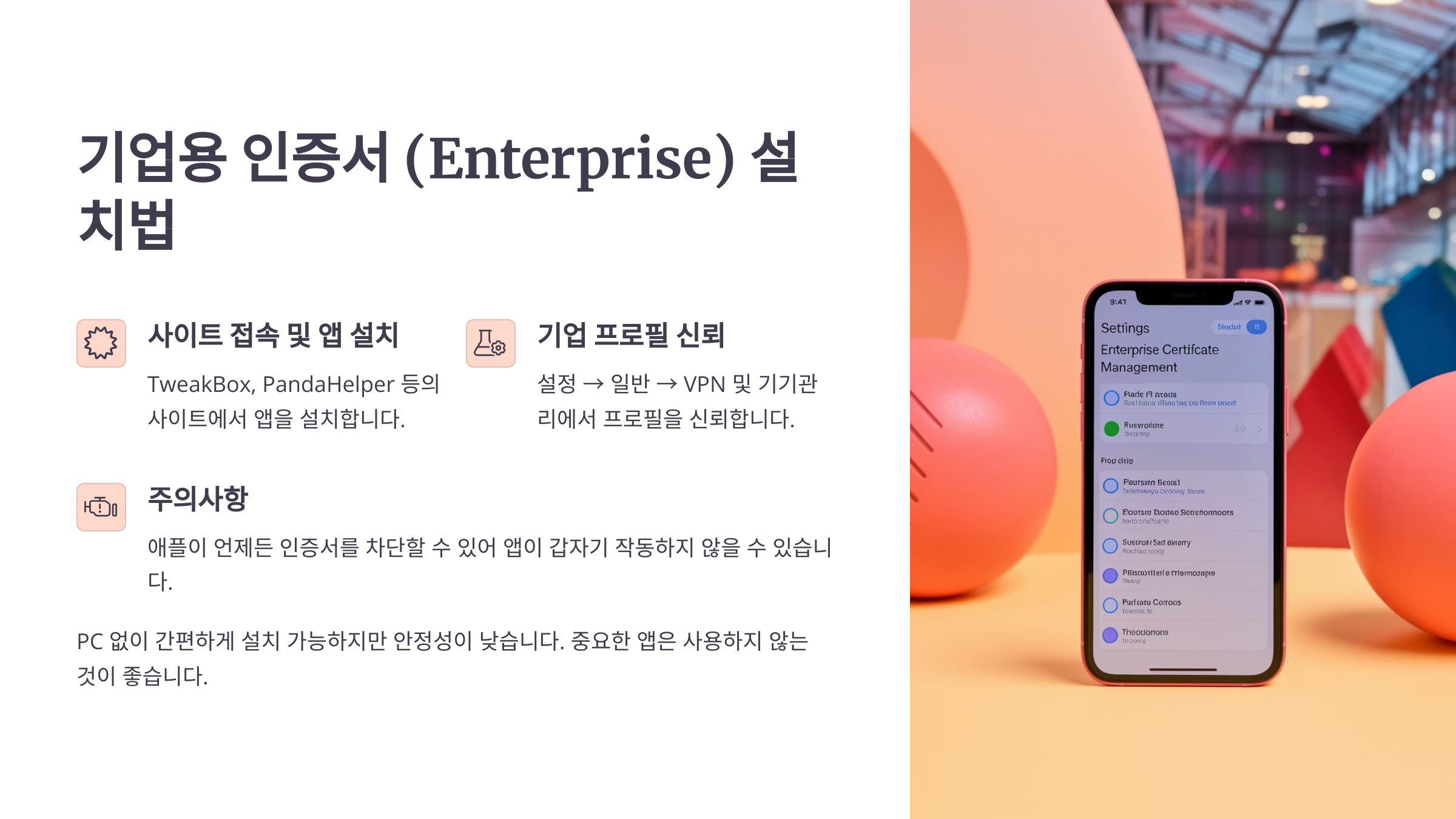 이제 다음 섹션 '기업용 인증서 (Enterprise) 설치법' 으로 넘어갈게요! 이건 회사 전용 앱 배포할 때 사용하는 방식인데 일부 앱 배포 사이트에서도 활용해요 🏢