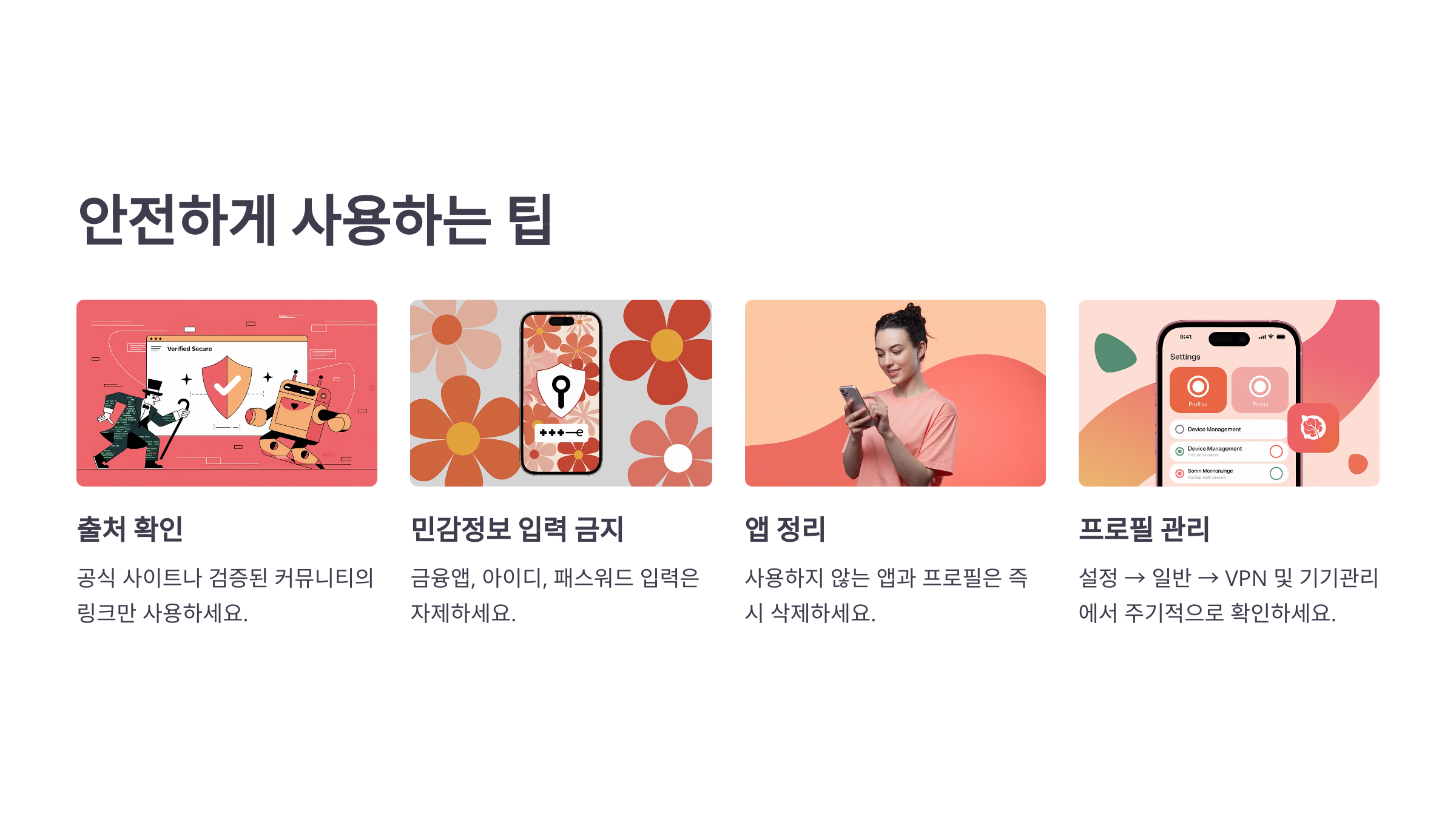 또 하나 중요한 팁! 프로필 삭제는 [설정 → 일반 → VPN 및 기기관리]에서 가능해요. 오래 안 쓰는 앱, 정체불명 앱은 바로바로 삭제해주는 습관이 좋아요.