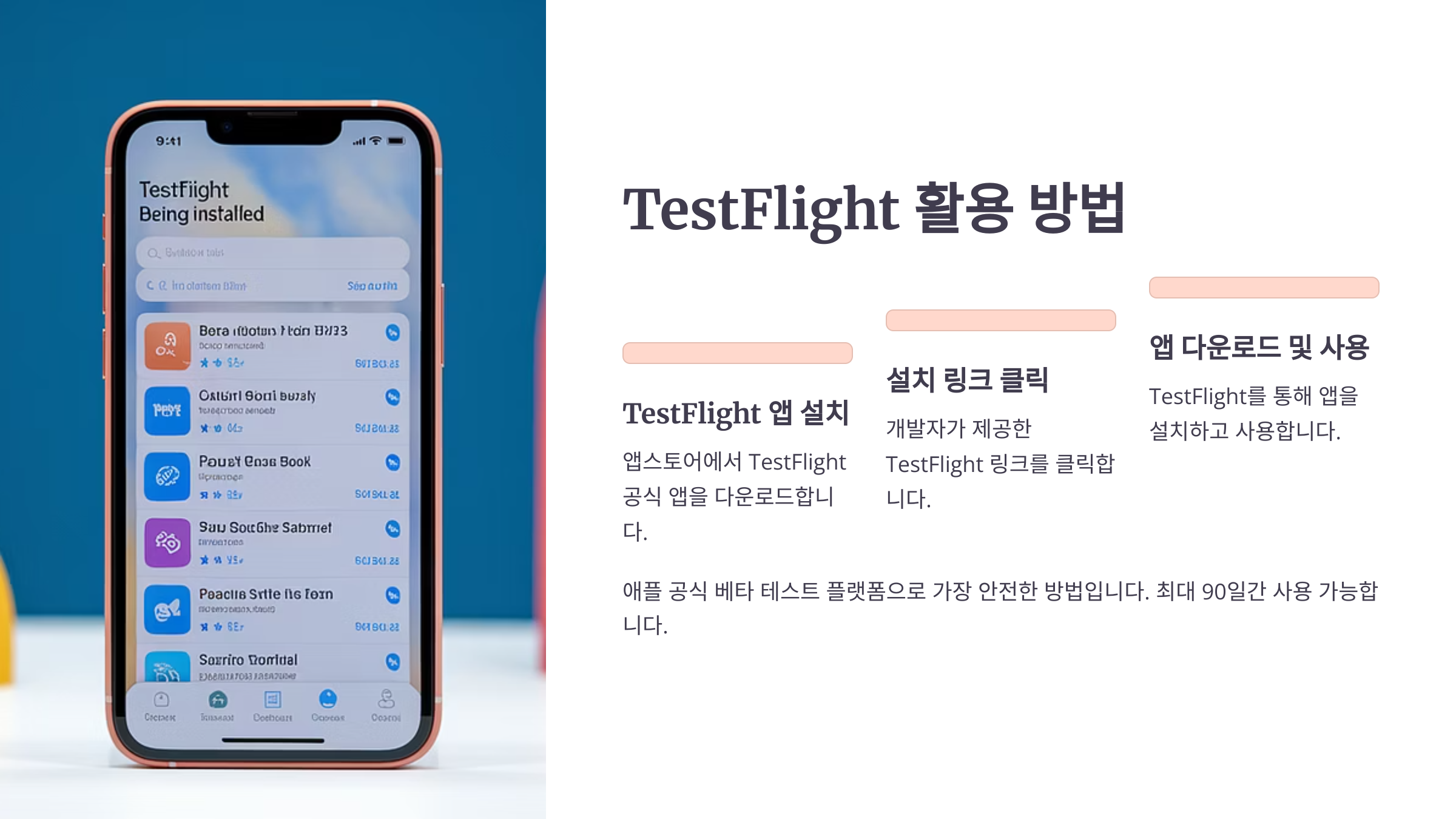 TestFlight는 애플이 공식으로 제공하는 베타 앱 테스트 플랫폼이에요. 그래서 가장 안전하게 앱스토어 없이 아이폰에 앱 설치할 수 있는 방법 중 하나로 인정받고 있어요.