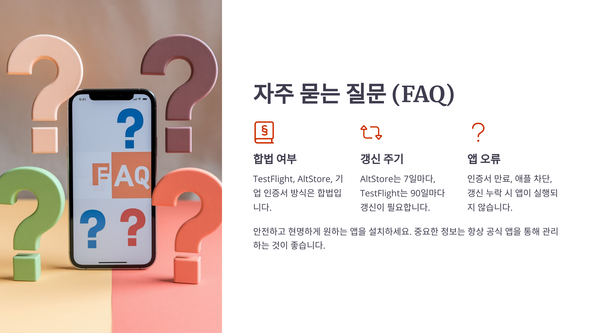 A1. 아니에요! TestFlight, AltStore, 기업 인증서 방식은 합법이에요. 다만 저작권 위반 앱이나 해킹 앱은 법적 문제 소지가 있어요.