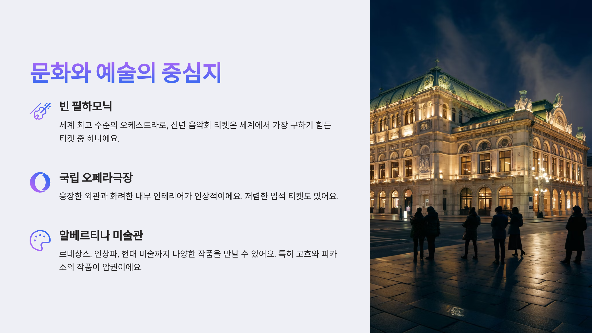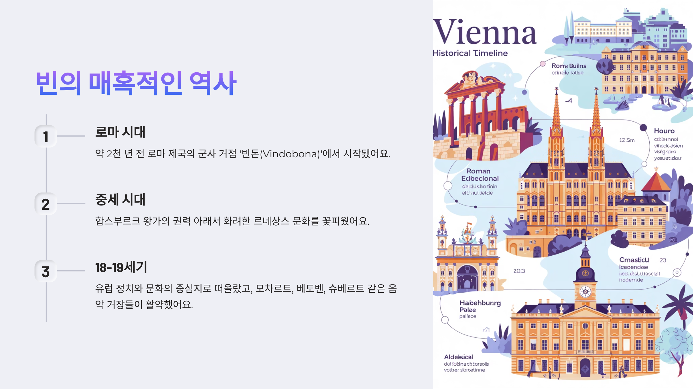 빈의 긴 역사 덕분에 오늘날 우리는 클래식 음악뿐 아니라 웅장한 궁전, 미술관, 전통 카페들을 쉽게 만날 수 있어요. 🎶