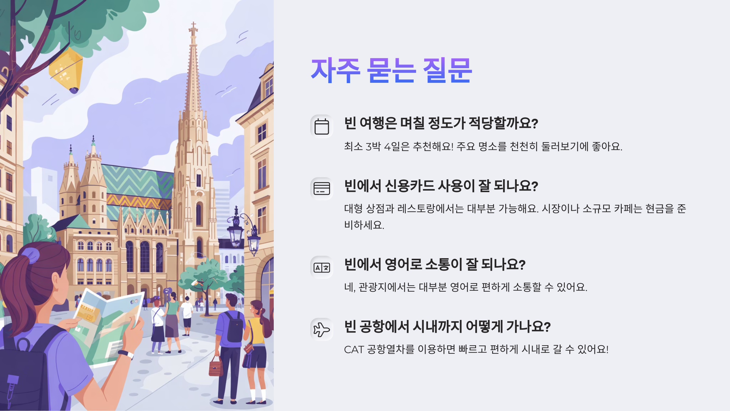 길거리 안전도 높은 편이라, 늦은 시간까지도 자유롭게 다닐 수 있어요. 그래도 사람 없는 골목은 조심하는 게 좋아요. 그리고 빈에서는 카드 결제가 거의 다 가능하지만, 시장이나 노점에서는 현금이 필요한 경우도 있어요. 💳