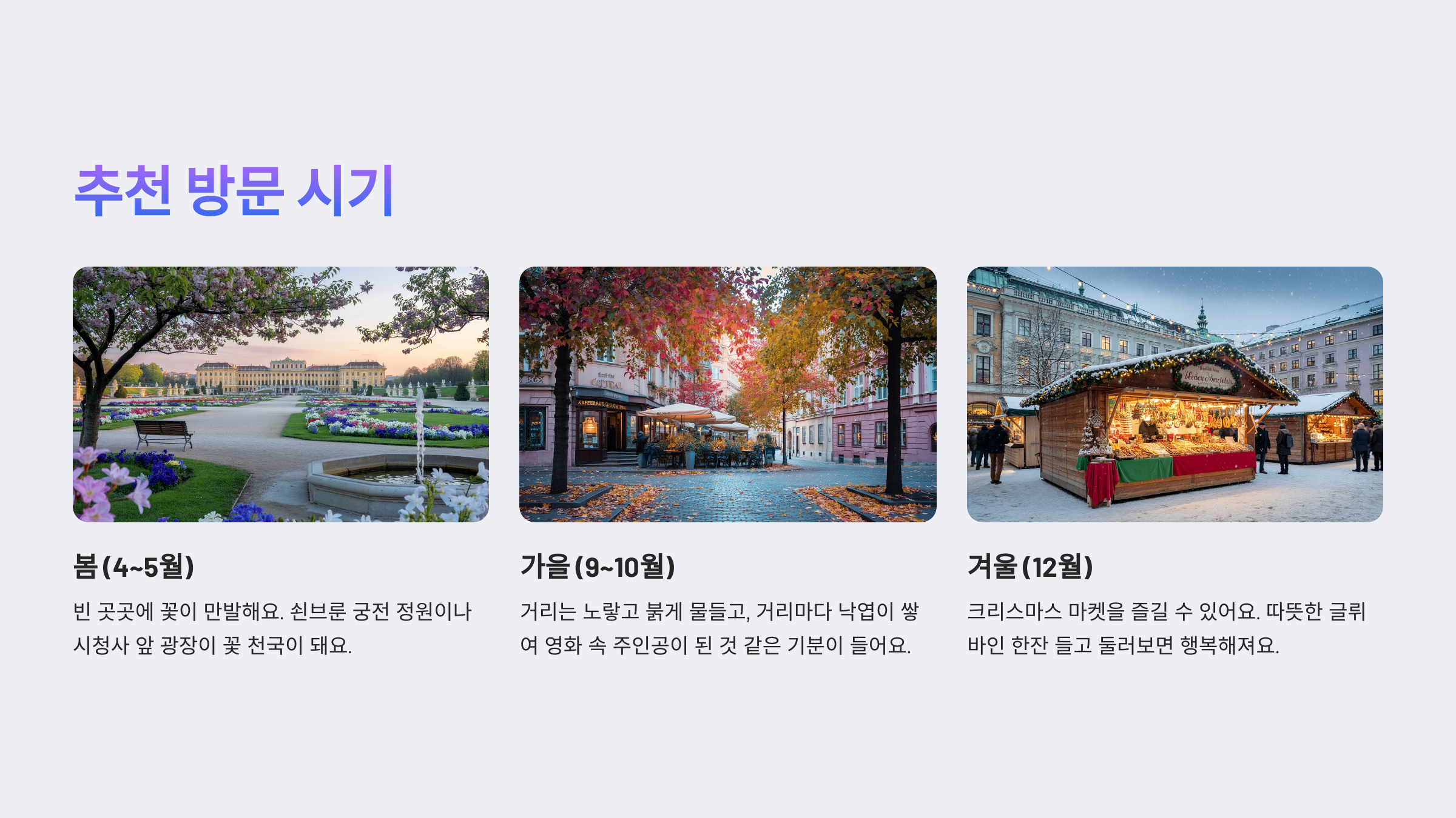 빈은 계절마다 다른 매력을 뽐내는 도시라서 언제 가도 좋아요. 그래도 가장 추천하는 시즌은 봄과 가을이에요. 날씨도 쾌적하고, 사람도 적당해서 여행하기 정말 좋아요. 🌷