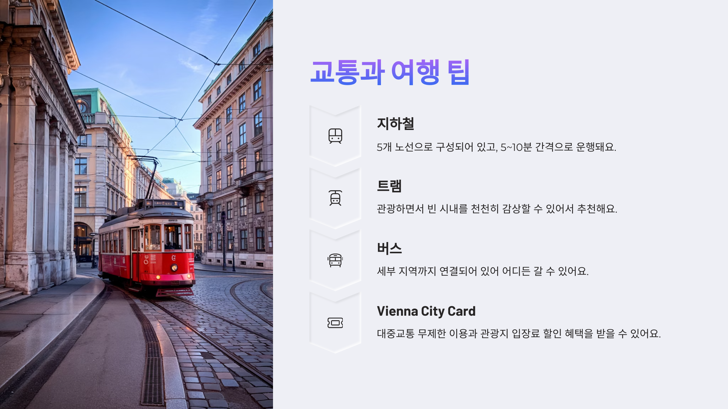 지하철은 5개 노선으로 구성되어 있는데, 대부분 5~10분 간격으로 운행돼요. 특히 트램은 관광하면서 빈 시내를 천천히 감상할 수 있어서 정말 추천해요!