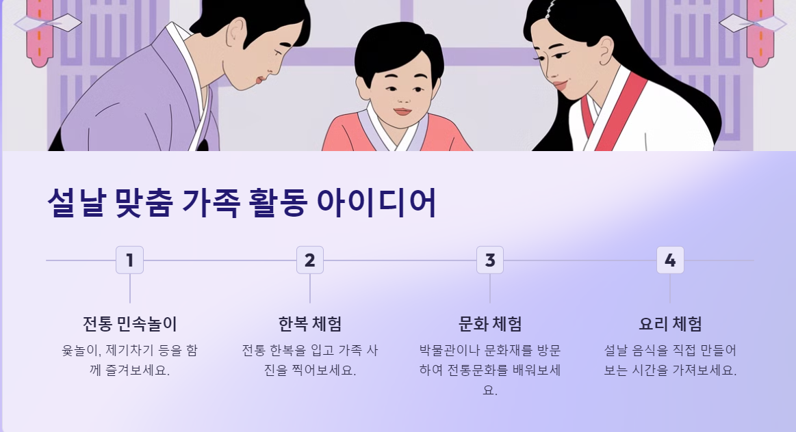 모든 가족 구성원이 함께할 수 있는 활동으로 즐거운 설날을 만들어보세요.