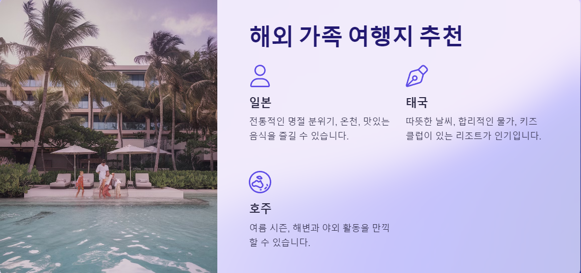 동남아시아의 태국이나 베트남은 따뜻한 날씨와 합리적인 물가로 가족 여행지로 인기가 많습니다. 특히 리조트와 키즈 클럽이 있는 호텔은 아이들이 즐기기에 최적입니다.