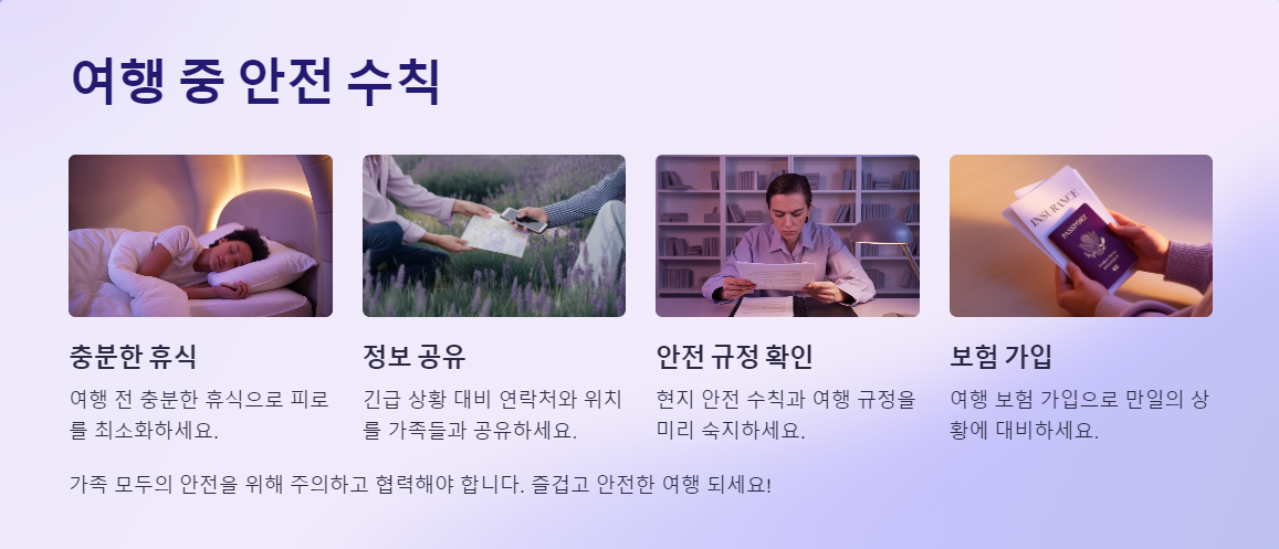가족의 안전을 위해 여행 전 충분한 휴식을 취하고, 피로를 최소화하세요.