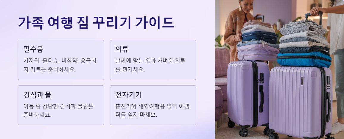 여행용 가방은 가족 단위로 정리하여, 필요한 물품을 쉽게 찾을 수 있도록 구성하세요.