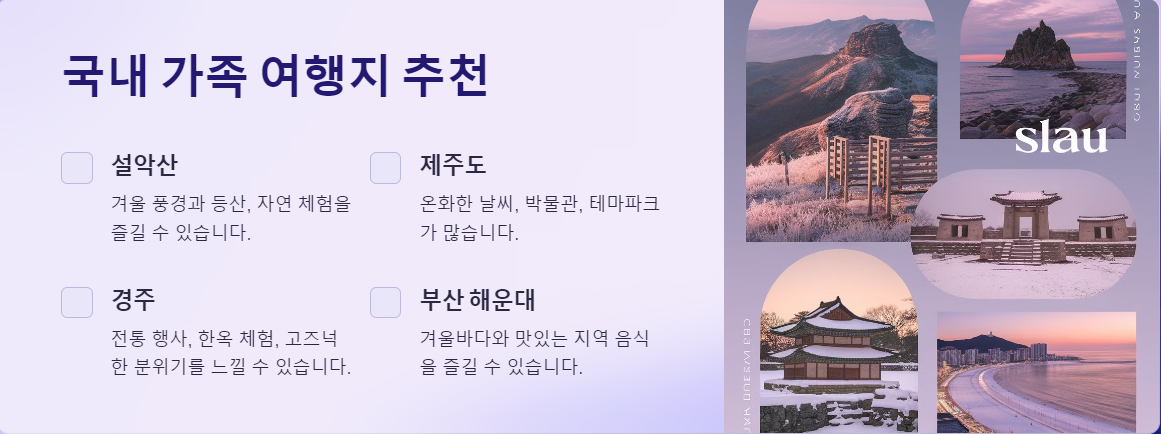 가족의 취향에 맞는 다양한 국내 여행지를 탐색하며 특별한 설 연휴를 계획해보세요.