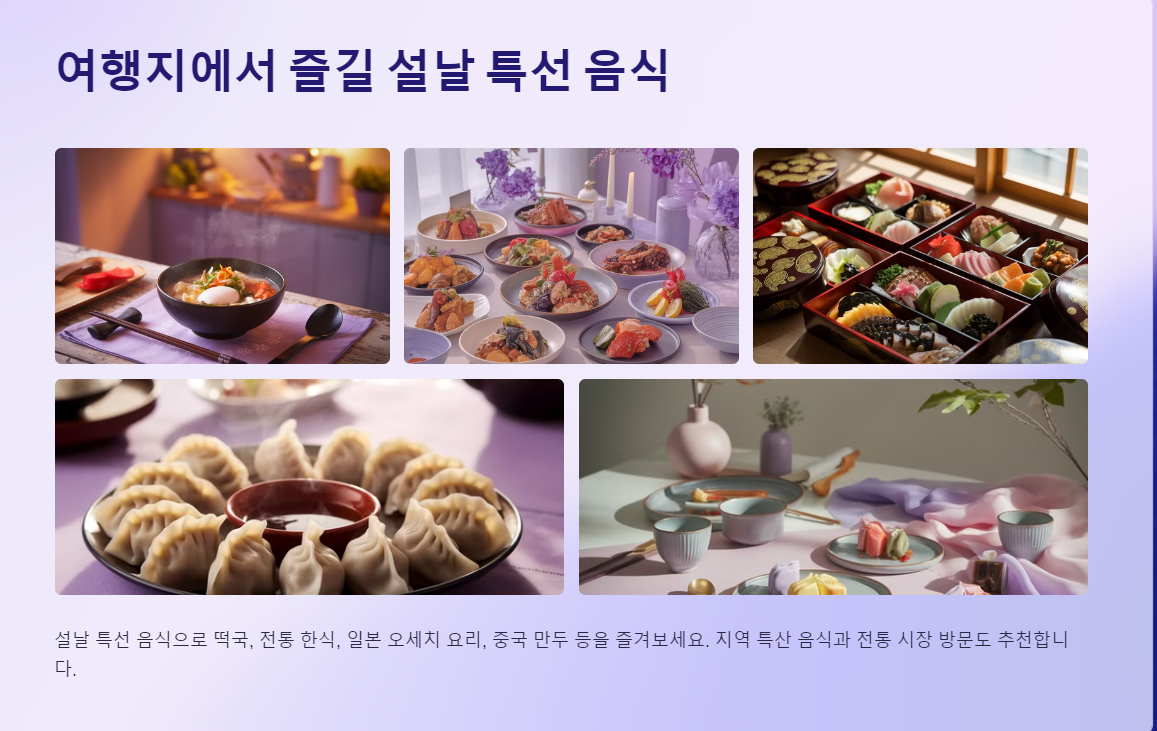 해외 여행 중에는 그 지역의 특별한 음식과 설날 전통 음식을 경험해보세요. 일본의 오세치 요리나 중국의 만두가 대표적입니다.