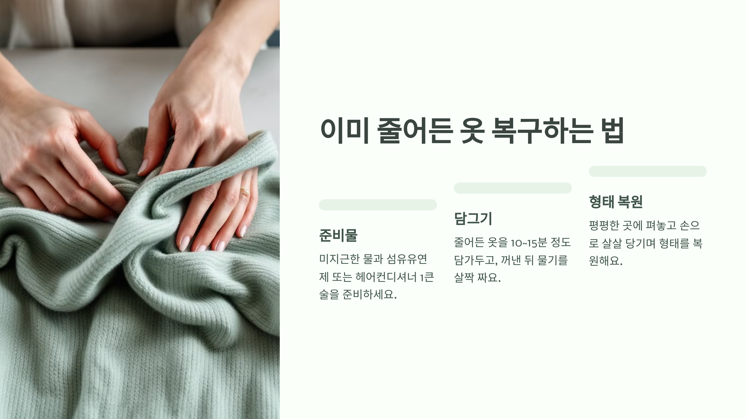 이 방법은 면, 니트류에 효과가 있고, 한두 치수 정도는 회복될 수 있어요. 단, 옷이 너무 작아졌다면 완전한 복구는 어려울 수 있어요.