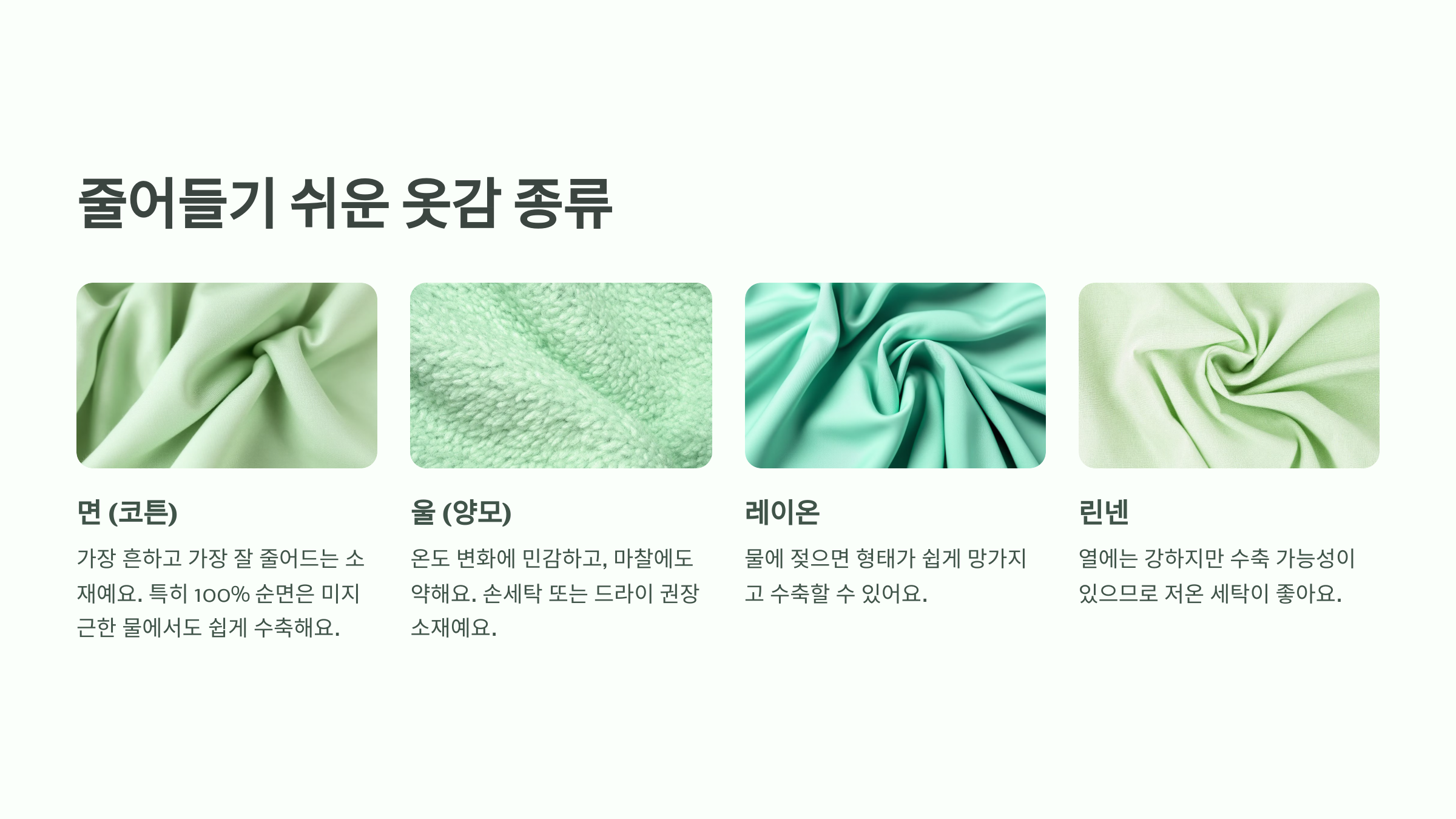 특히 뜨거운 물로 세탁하거나, 고온 건조기에 돌리는 게 가장 큰 원인이에요. 섬유는 원래 약간의 수축성이 있는데, 강한 자극이 가해지면 본래 형태로 돌아가려는 성질 때문에 줄어들게 돼요.