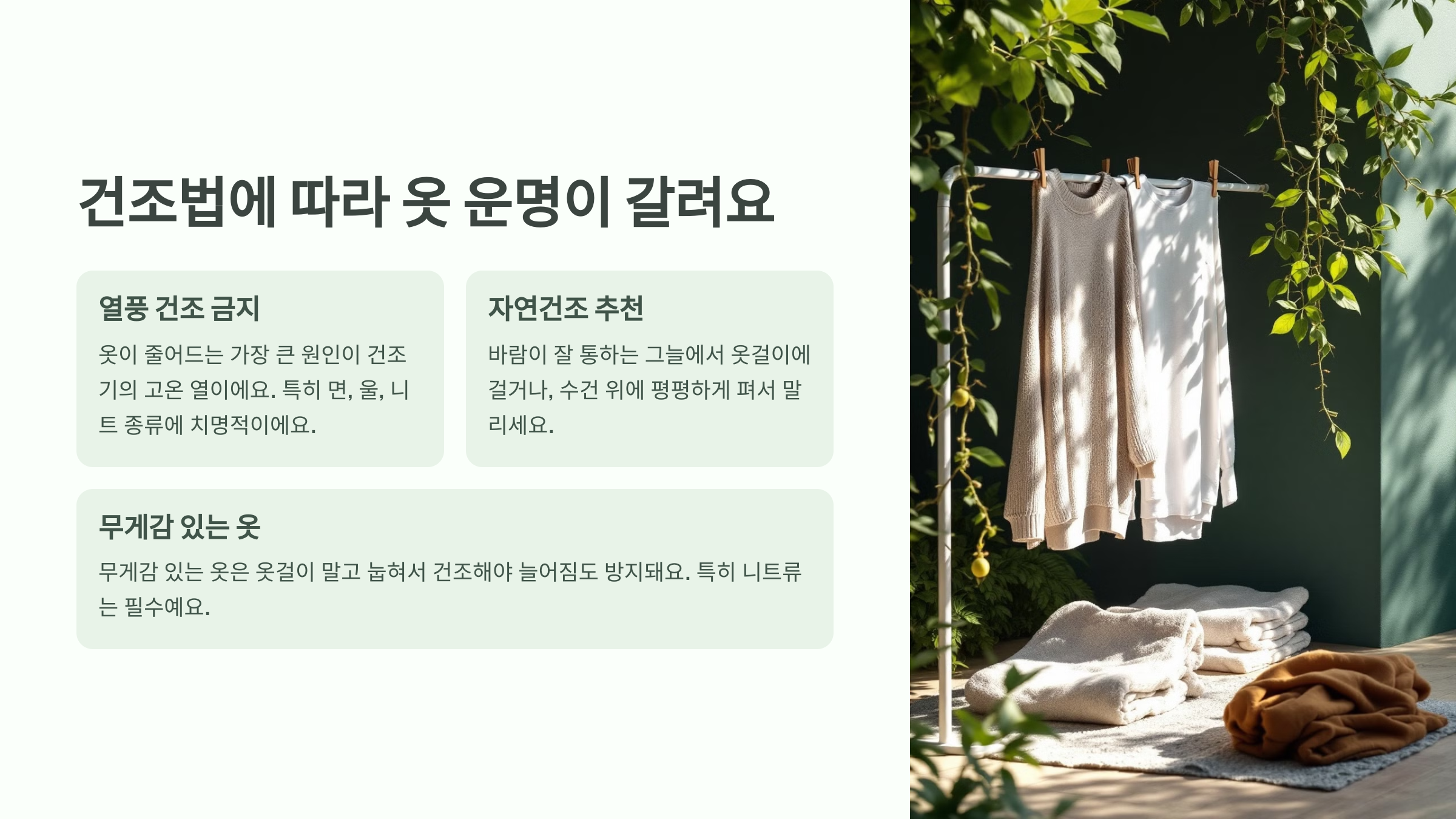 세탁만큼이나 중요한 게 건조 과정이에요. 옷이 줄어드는 가장 큰 원인이 건조기의 고온 열이라는 거 알고 있었나요?
