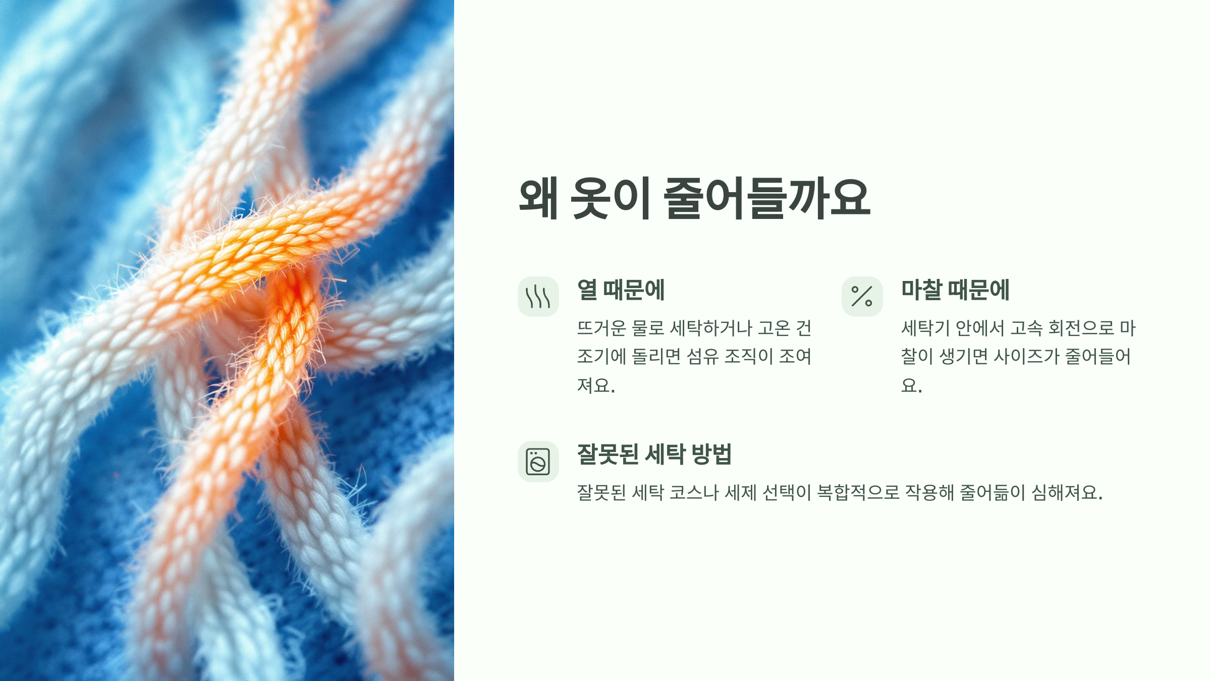 옷이 줄어드는 가장 큰 이유는 열과 마찰이에요. 세탁기 안에서 옷이 뜨거운 물에 세탁되거나, 고속 회전으로 마찰이 생기면 섬유 조직이 조여지면서 사이즈가 줄어들어요.