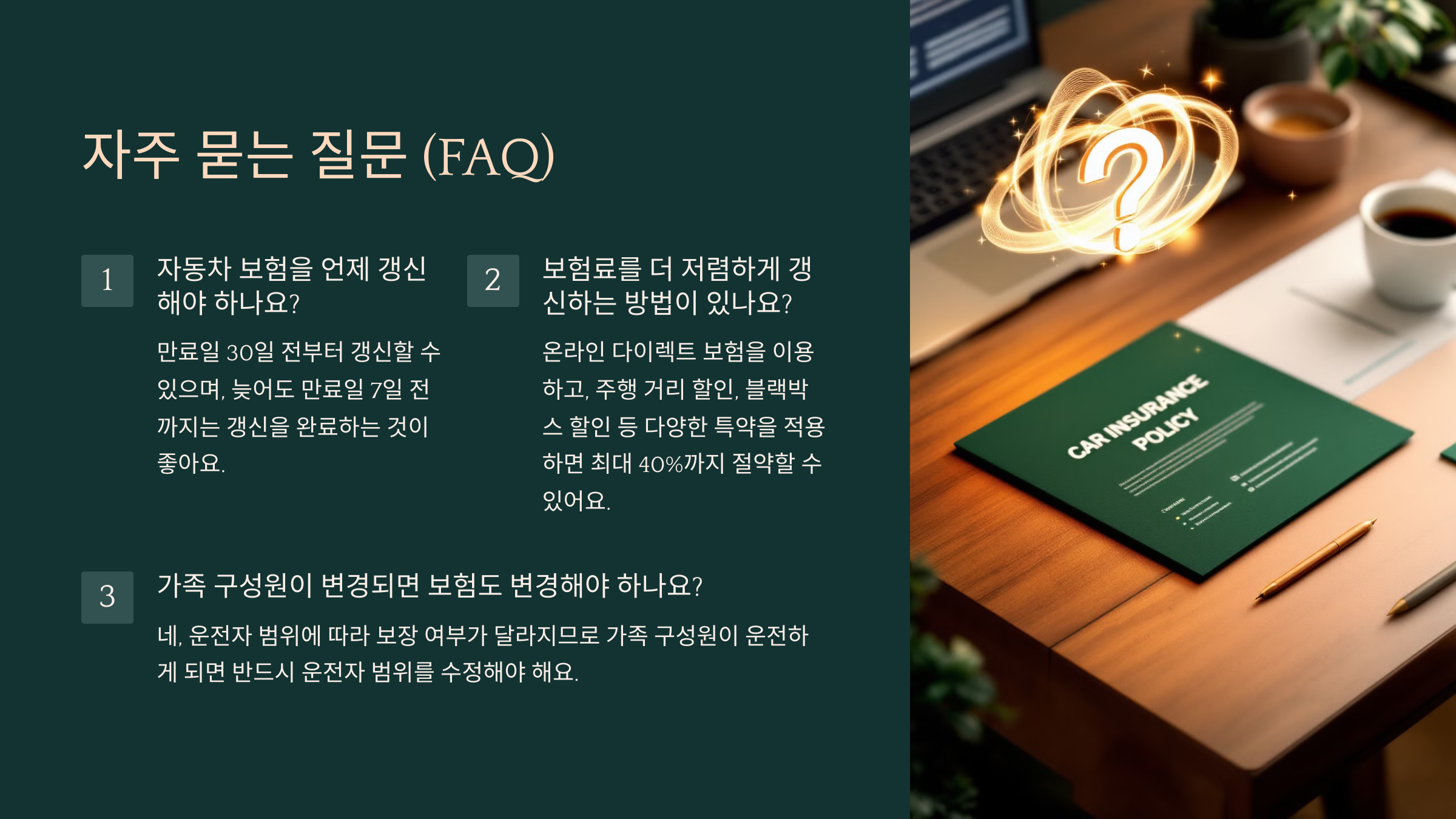 이제 마지막으로 **FAQ**를 통해 자동차 보험 갱신에 대해 자주 묻는 질문들을 정리해볼게요.❓🚗